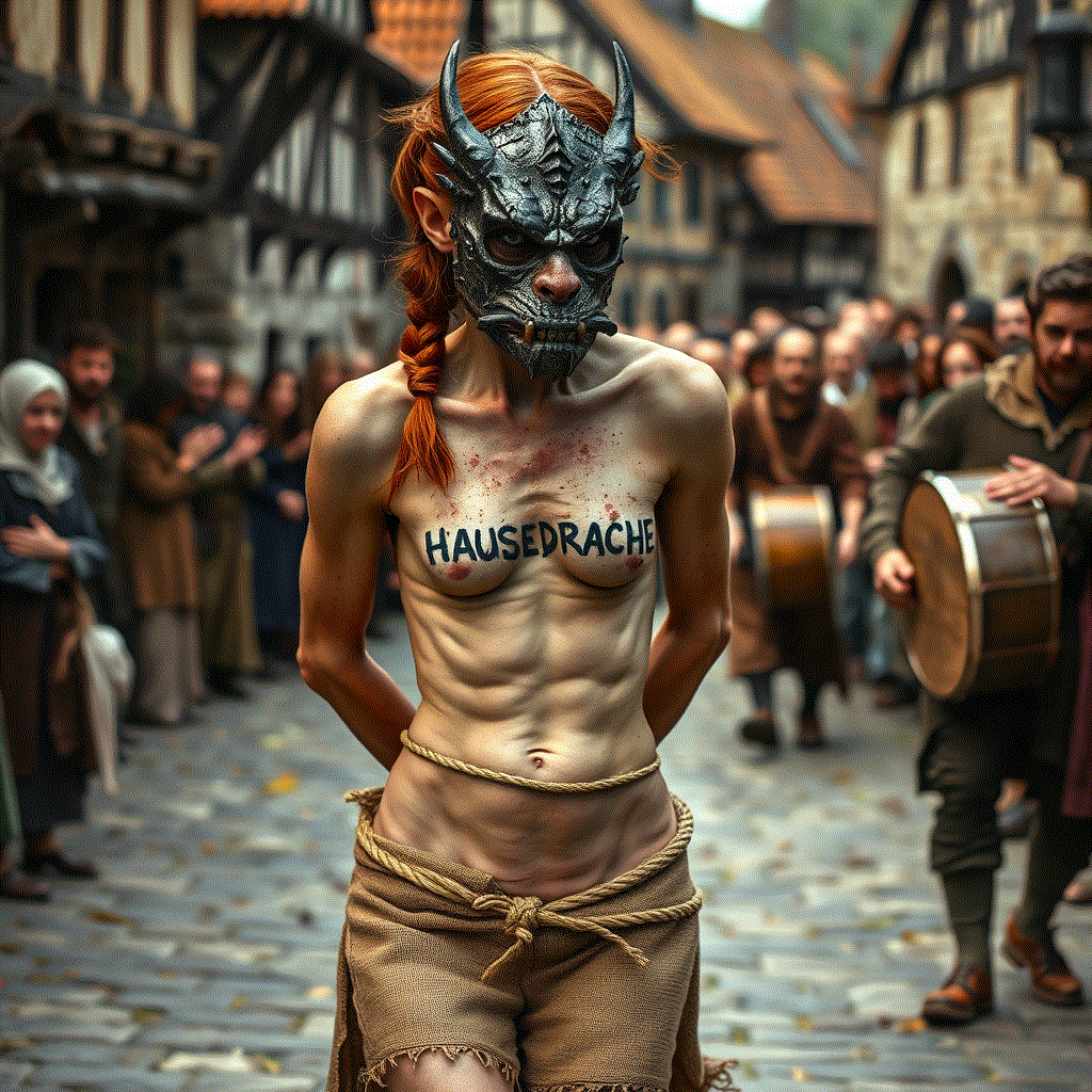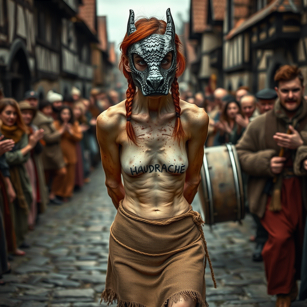 Stripped of all dignity, she stood in the coarse burlap undersmock, its rough weave chafing her skin. The thin fabric offered no modesty, clinging to her gaunt frame. Her breasts, small and saggy from years of childbearing and meager sustenance, were shamefully visible, two pathetic mounds of flesh exposed to the winter air and a thousand mocking eyes. Her feet, calloused from a lifetime of labor, were bare on the frozen earth, the cold seeping into her bones. Her arms, thick with a lifetime of kneading bread and scrubbing pots, were bound tightly behind her back, leaving her utterly defenceless.