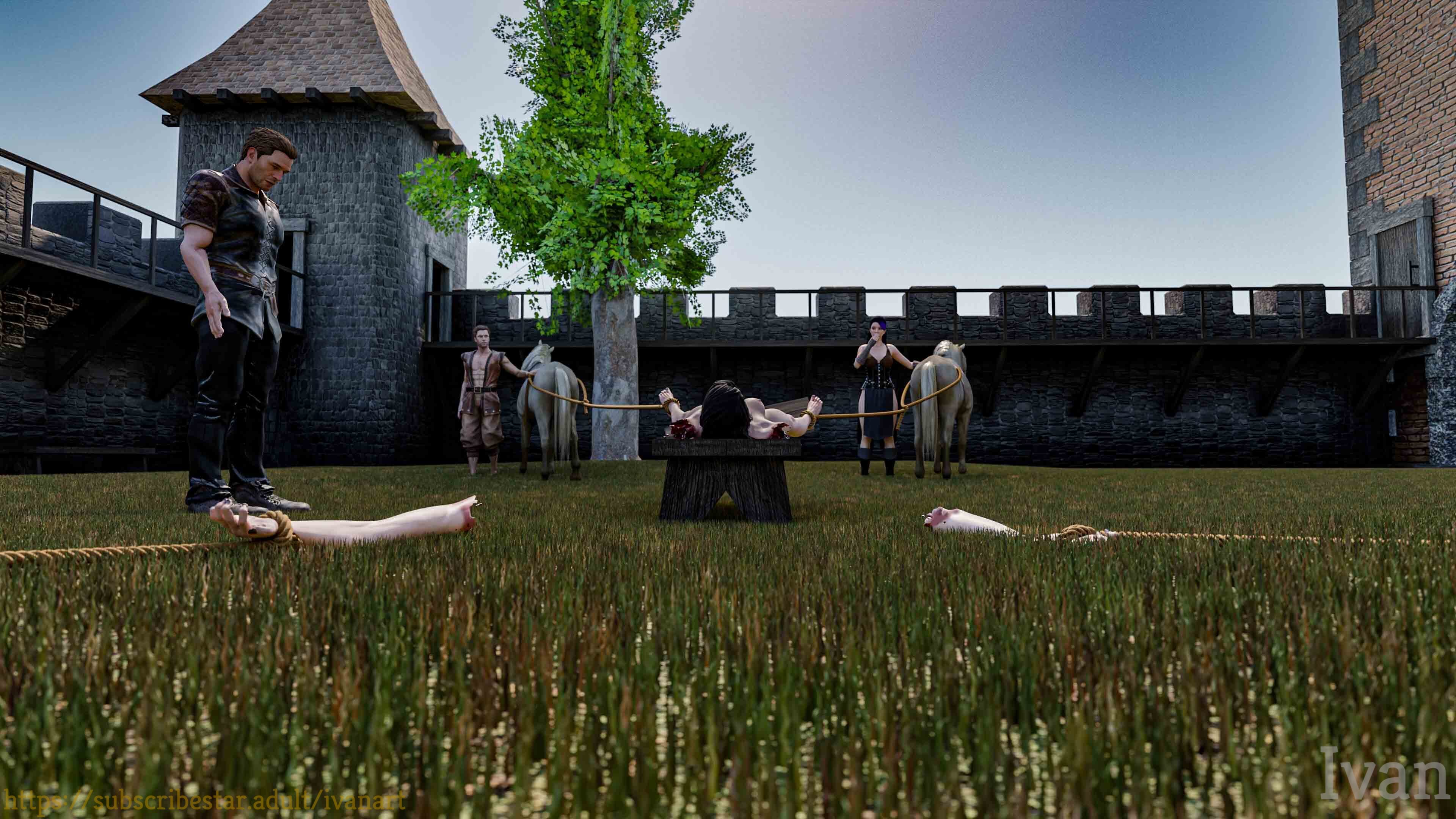 The woman is stretched to her limit then relaxed a few times to prolong her pain. Then the command is given to pull harder on her arms one at a time so they are ripped off individually. From now on she is in a world of constant agony.