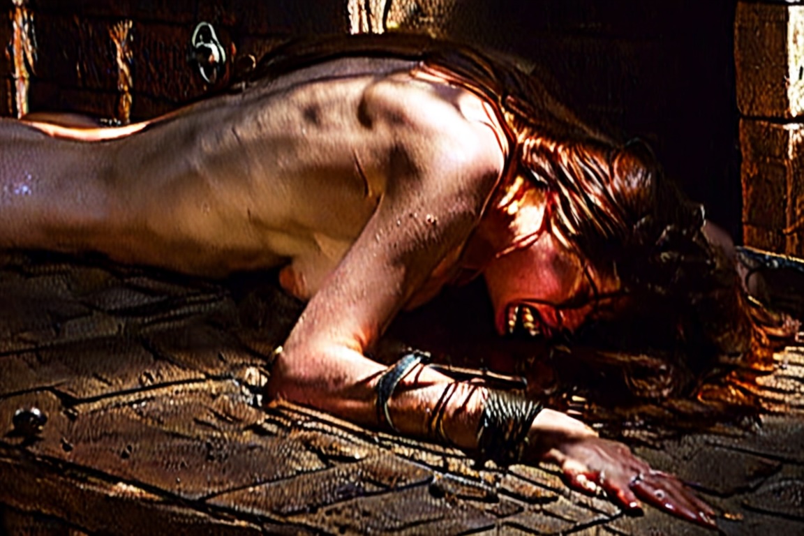 The female interrogator's filthy hand touches the body of a helpless naked rebel.