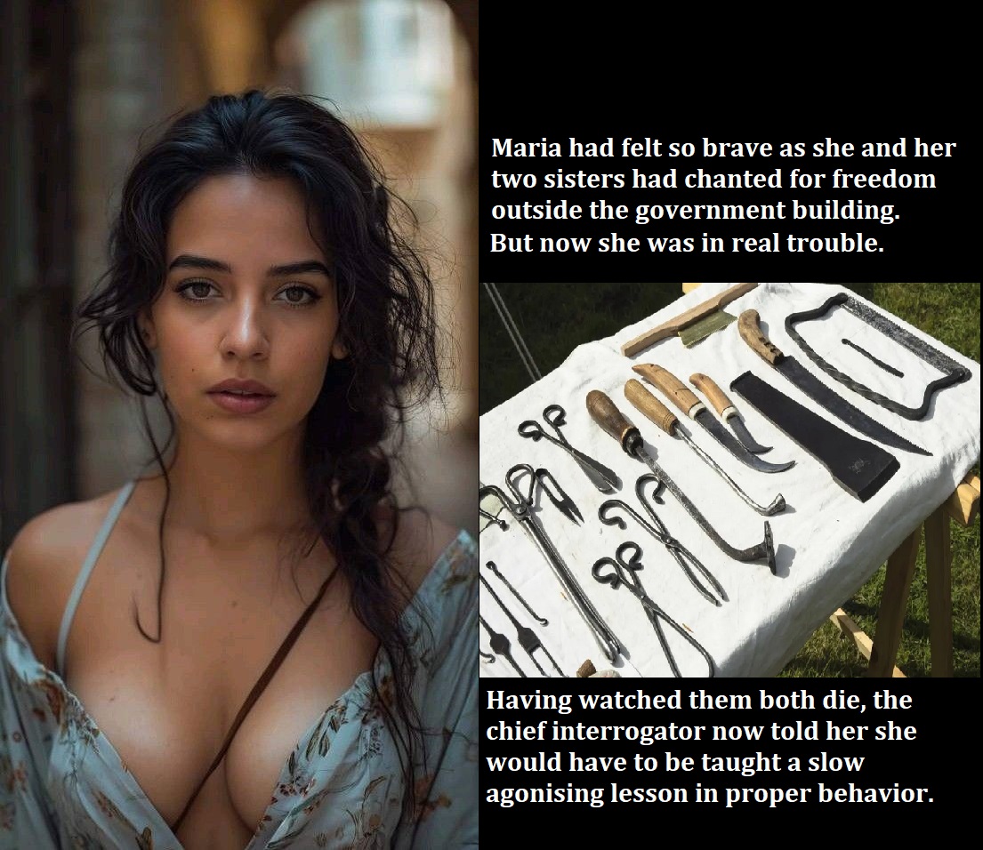 Hmmmmm, I think she's going to be very sorry and be suffering long. Her fear leaks on her naked wide spread thighs, chained to the floor, arms above her head, lifted to the ceiling as she sees the executioner walk to the table. A puddle of fear forms in the middle between her legs. We call that a good start. But it's also too little, and so so late.mothbrad wrote: ↑Fri Aug 30, 2024 2:44 amInspired by these.KirstensKutje wrote: ↑Mon Aug 12, 2024 7:32 pm I like to create captions. Sometimes you can create more of a story in two or three sentences and an image than with a whole story. If anybody has ideas or request, I'm open for suggestions!