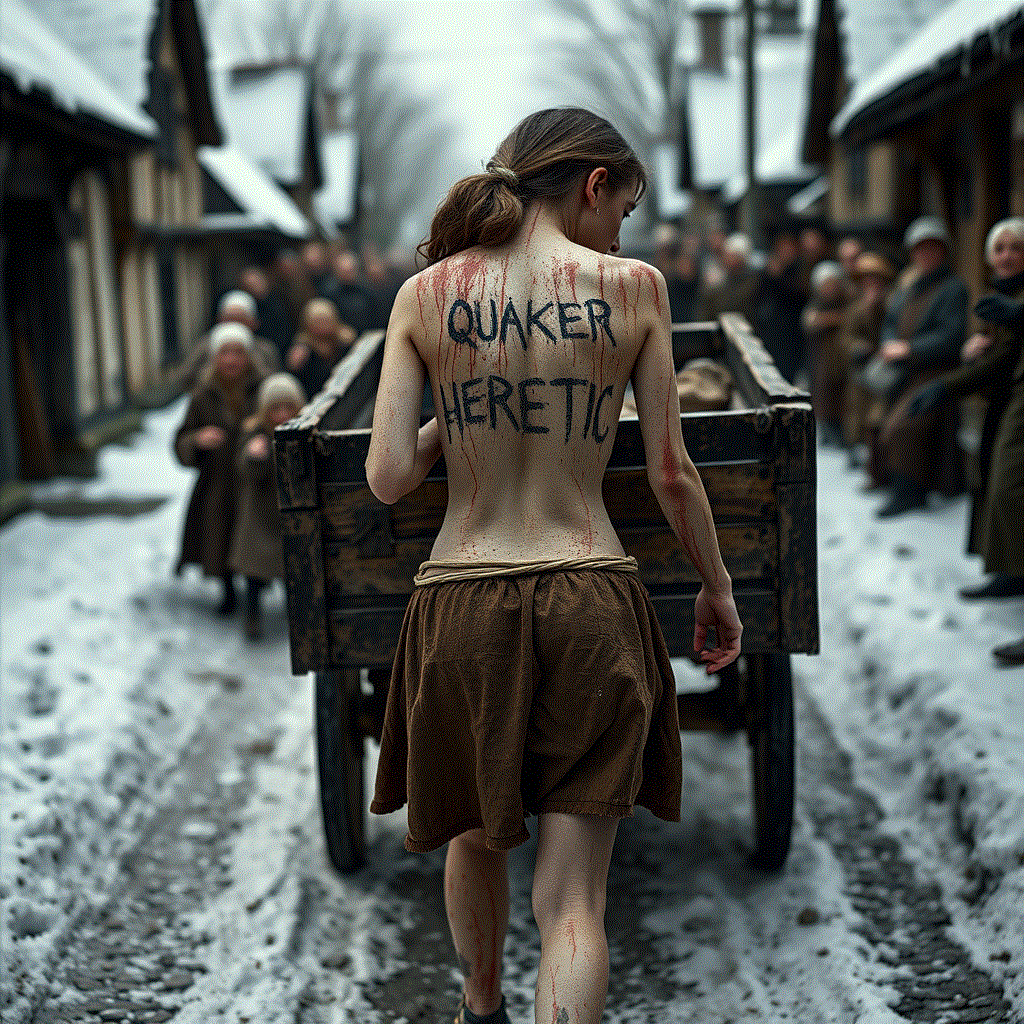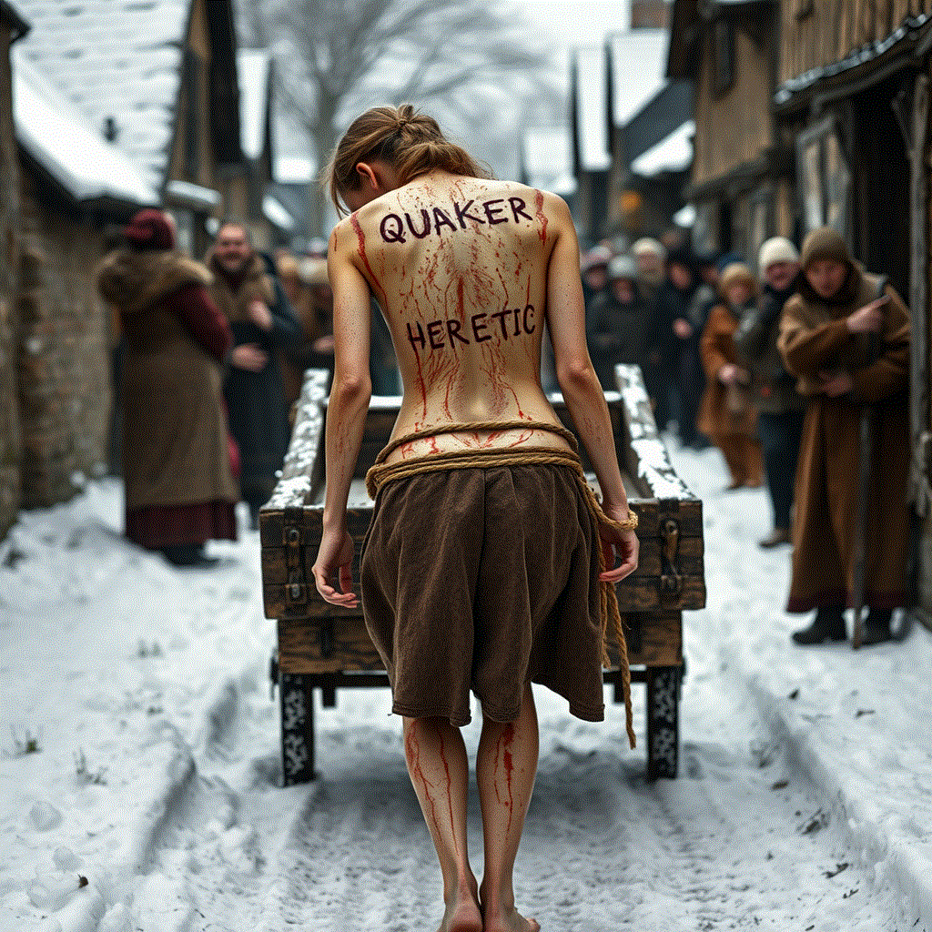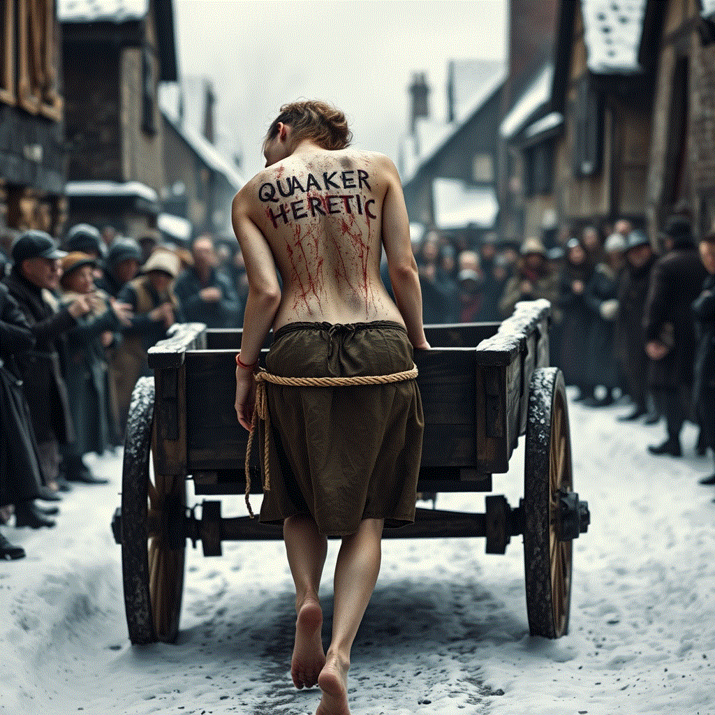 Quaker heretics in both England and New England were subject to the Cart Whip act. They would be stripped to the waist and tied to the tail of a cart. The then would be dragged through the streets of the village and whipped before the assembled villagers. They would receive at least 10 strokes of the whip. Then they would be transported to the next village to be whipped again. This would be repeated until they were returned to their place of origin. In Massachusetts, three Quaker women were sentenced, in mid-winter, to be whipped in 10 towns for a total of 100 lashes. They were to be dragged a total of 80 miles through deep snow, half naked and shivering with cold.