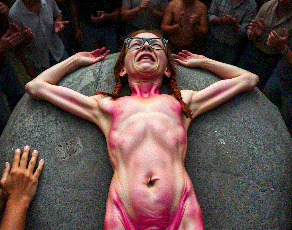 They stretched her out on her back on the stone and stretched her arms and legs, tying them to two stakes. Her back was arched and her belly stretched tight as the head of a drum