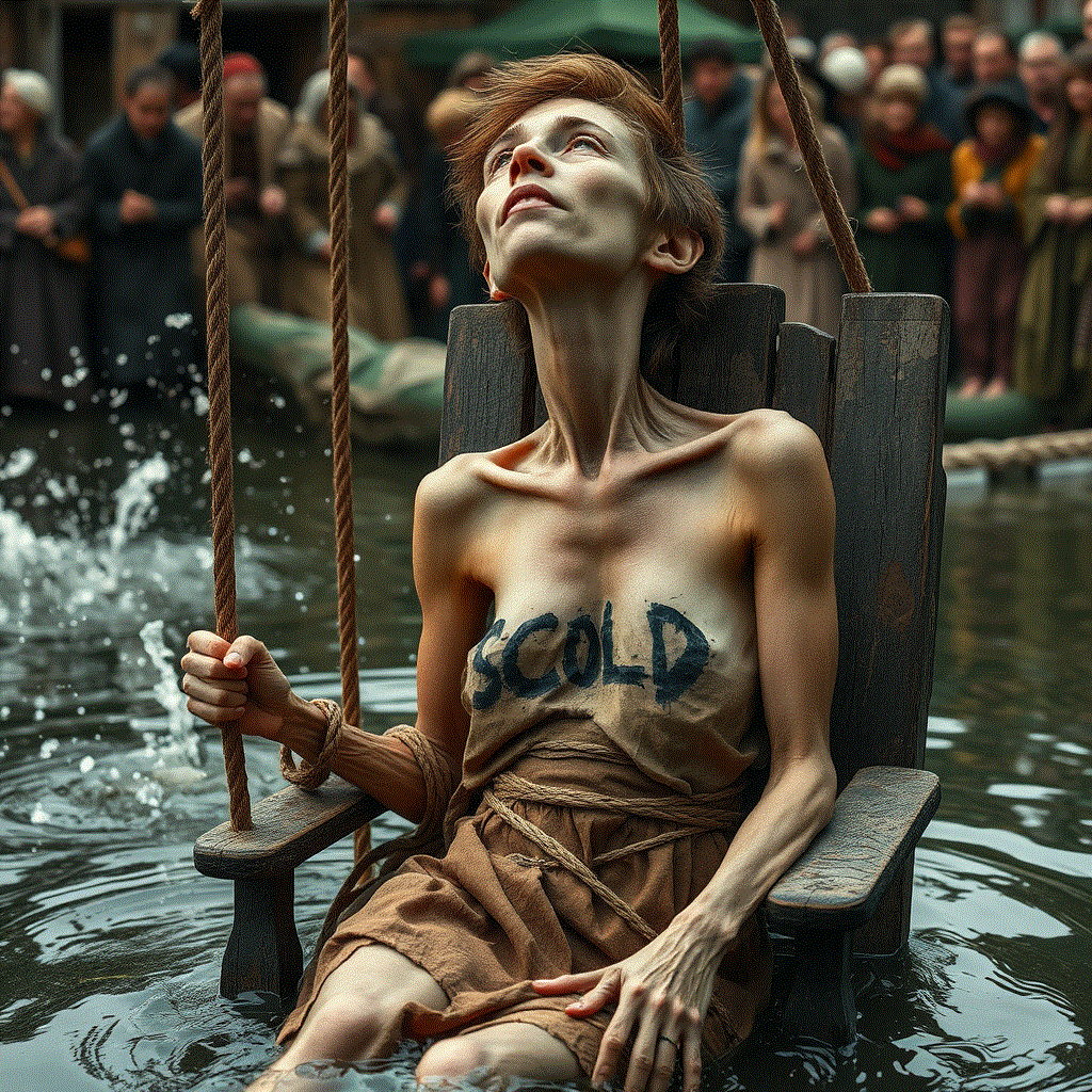 They swung the chair back to shore and set it down. The tattered remnant of her smock was torn from her body and tossed into the pond. “Now close your eyes. You aint worthy to look at my manly cock.” She shut her eyes tight. He stepped over to position himself in front of the chair. Instead of lowering his pants he reached down and picked up one of the great turd bobbing in the water. “Open wide it’s coming in.” he said. He shoved the turd into her open mouth and half way down her throat. Then he lifted her chin to force her head back and her mouth shut. “Swallow it, Swallow it” the crowd chanted. Eleanor knew that even if she could spit the turd out it would be the end. They would continue to duck her until she drowned. She thought of other women from the village histories who had drowned here in this very pond. Their backs pressed into this very stool. The same iron band cinching about their waists. She fought against the gag reflex and chokingly swallowed. Her stomach revolted and sent the turd up again filling her mouth. Again and again she choked and swallowed till at last she had no strength to bring it up. He released her chin. Her head lolled forward brown slime dribbling from the corner of her mouth, down her chin to drip on her chest. The mob had finally found release in this ultimate act of humiliation. They stood there looking on, exhausted and fully sated before they undid the bands and tilted the unconscious woman into the mud beside the pond.