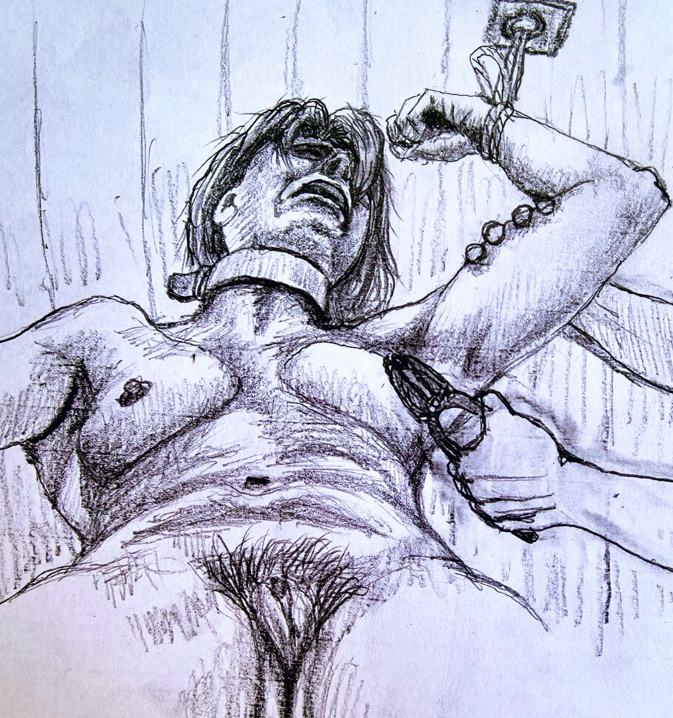 I just love the position in both images; supine and stretched, with her legs splayed wide and tied to the legs of the torture table.