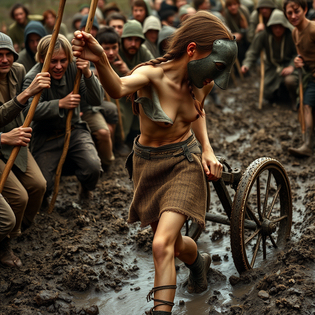 The young women of the village prepare for the May dance. Dressed in their finest they kneel in the town square. The young men begin a circle dance around the gathered young women. One by one the men enter the circle and chose a woman to join them in the dance, giving them a garland of flowers. The circle of dancing couples grows and the remaining group of women shrinks. Finally, there remains one unchosen woman, Das übrig gebliebene Mädchen. The ring of dancers closes in on her and tears the clothing from her body. For her there are no flowers. Rather she is garlanded and pelted with rotting fish. The circling dancers wrap ropes around her cringing body, pinning her in place as the joyous village circles around her.