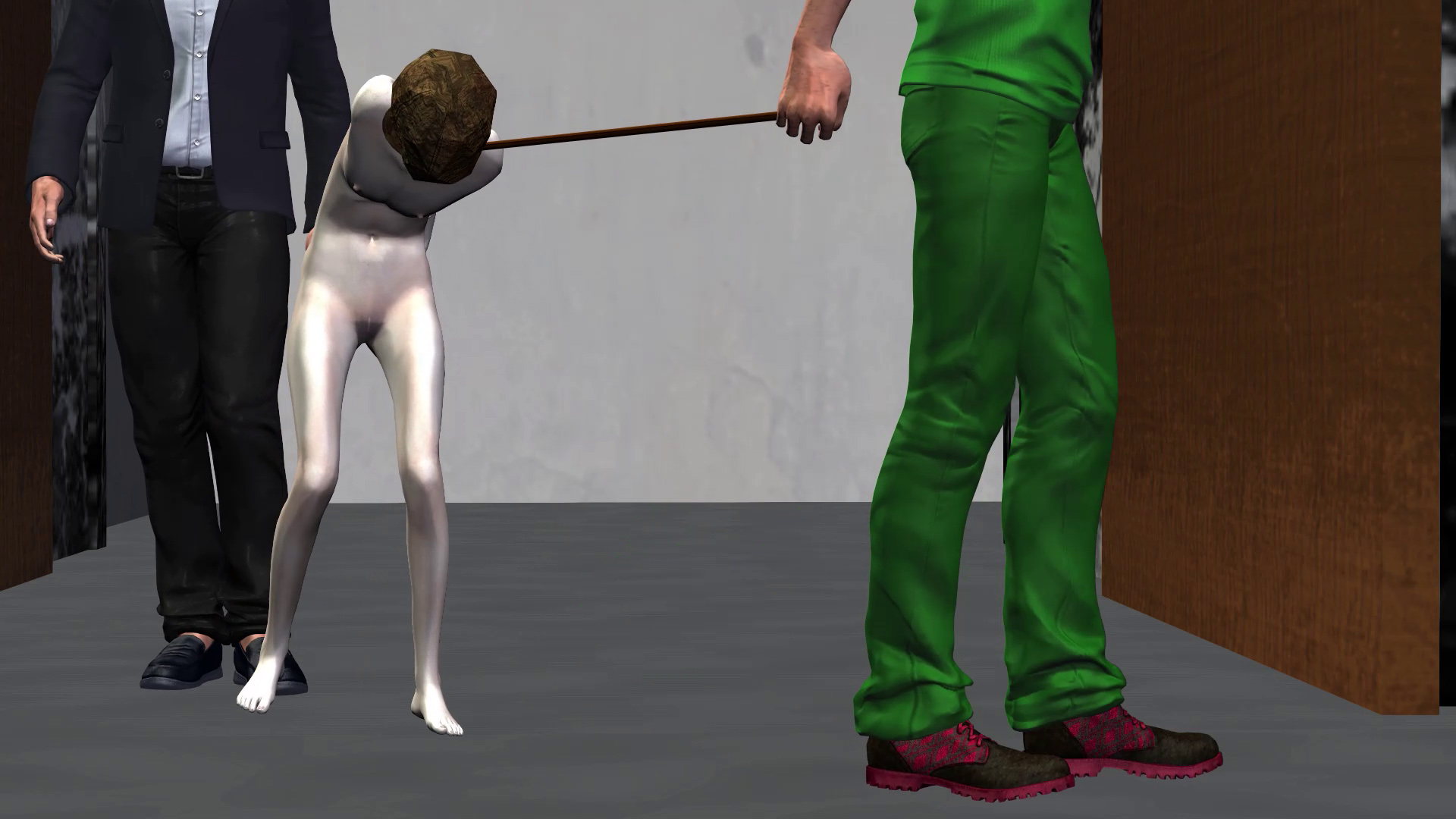 As the suit leaves, one of her tormentors takes hold of the metal sheet she is sitting on.