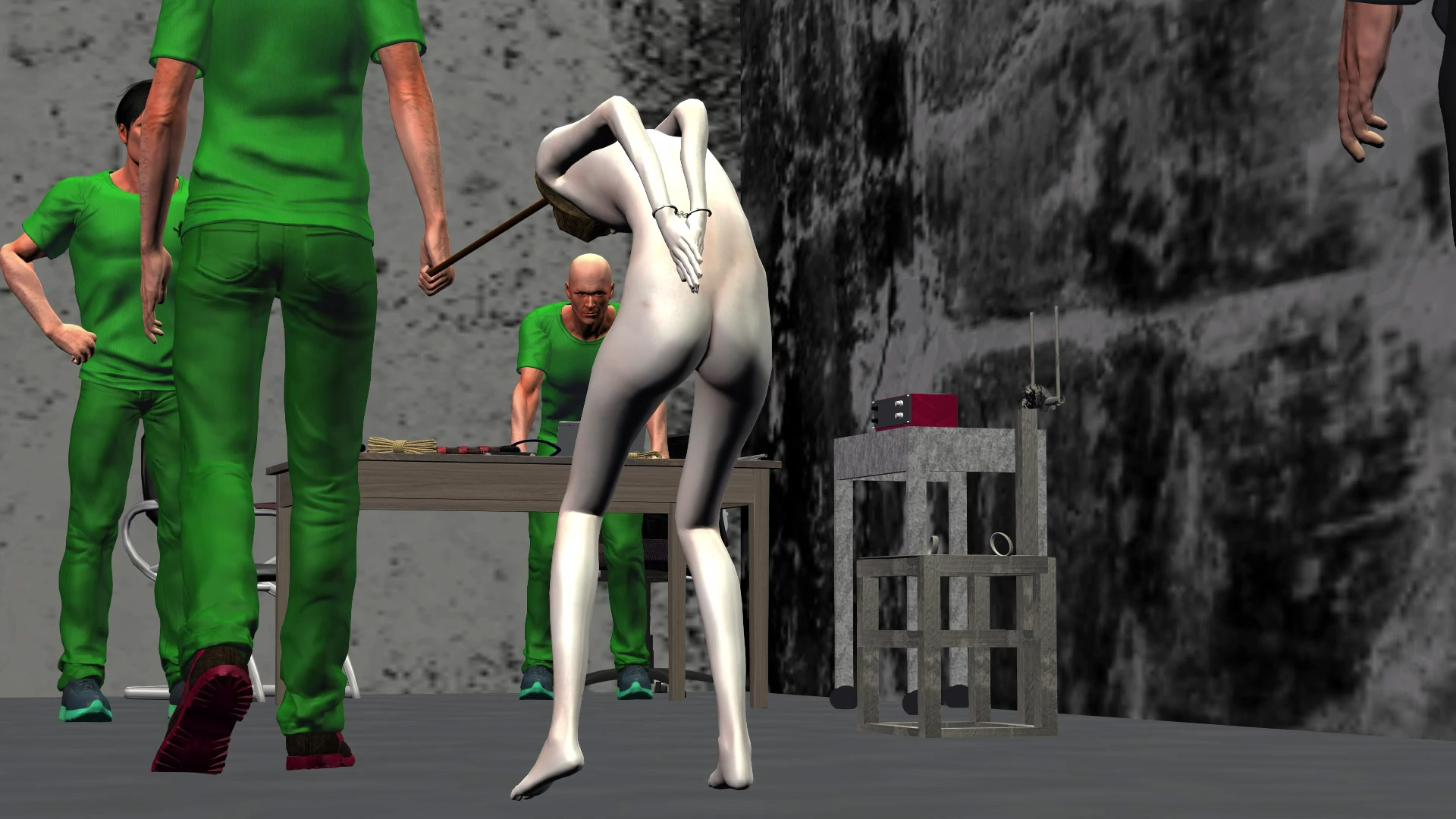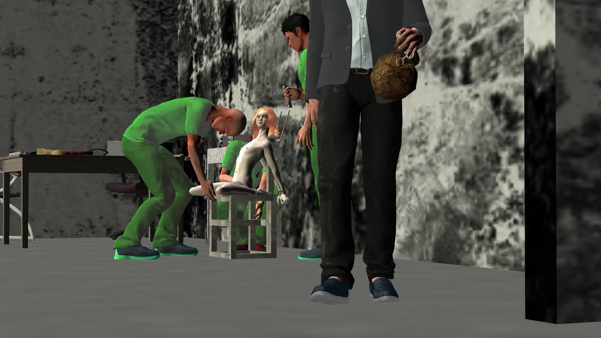 Calling it an 'interview room' is far from what is usually so. Two more guards are ready to start working on Daria. They have a special chair waiting for her.