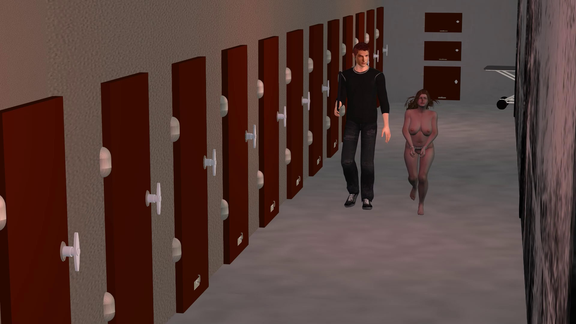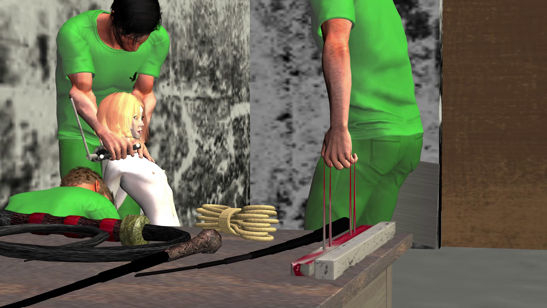 The room is large enough to house different means of persuasion. That water tank is not for her, but many items on the table will be used on her. Only when she is secured will the hood be taken off and she will meet her torturers and understand her fate.