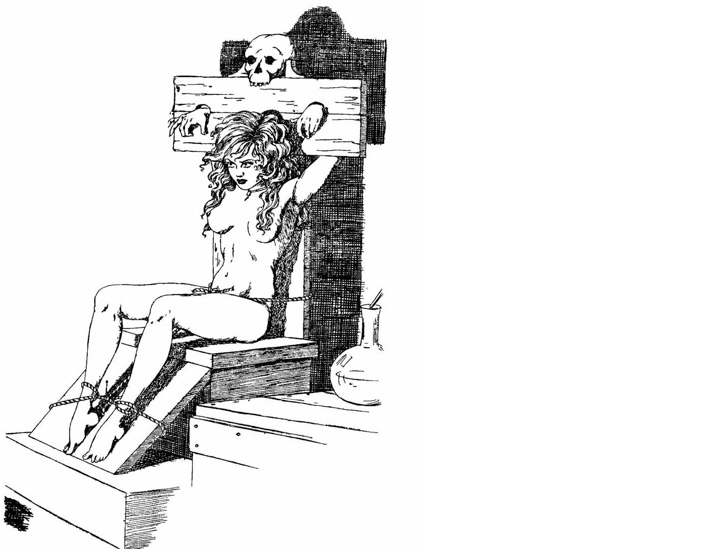I like the 'chair'. A useful position for her to be in. He can either whip her breasts bloody, or beat her shins with a club.