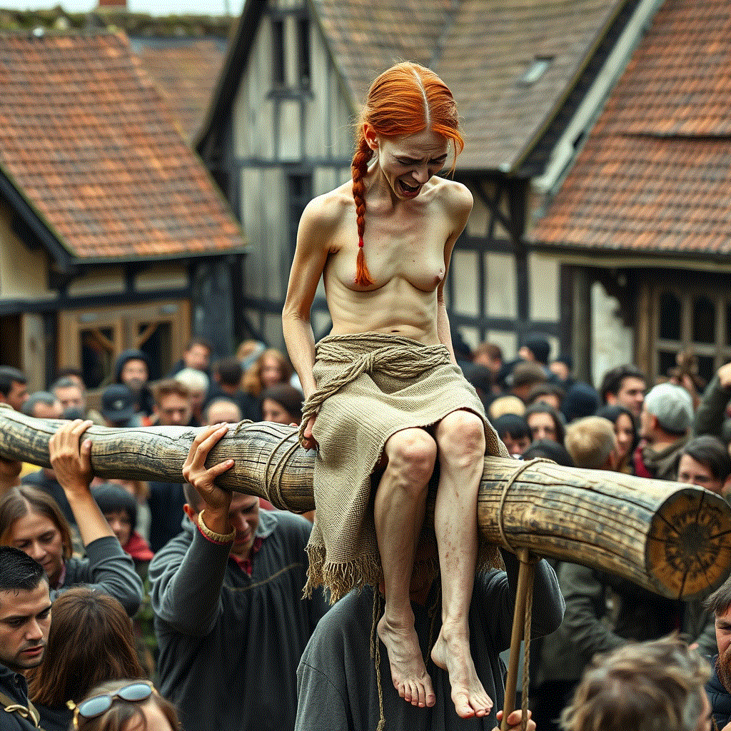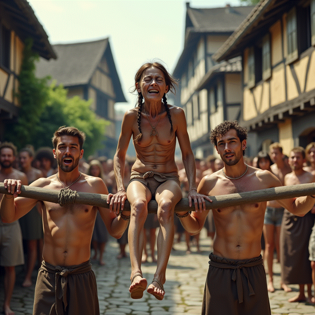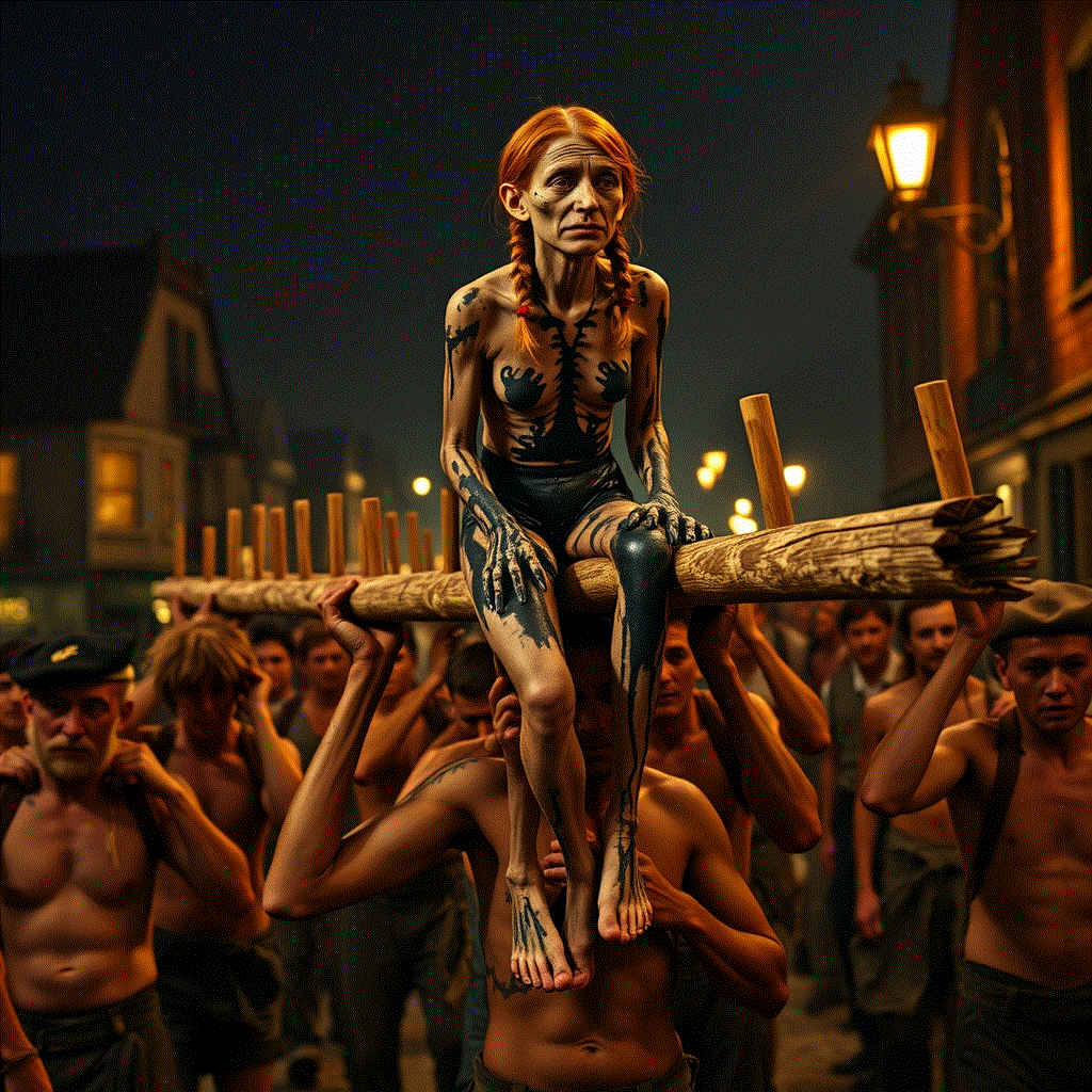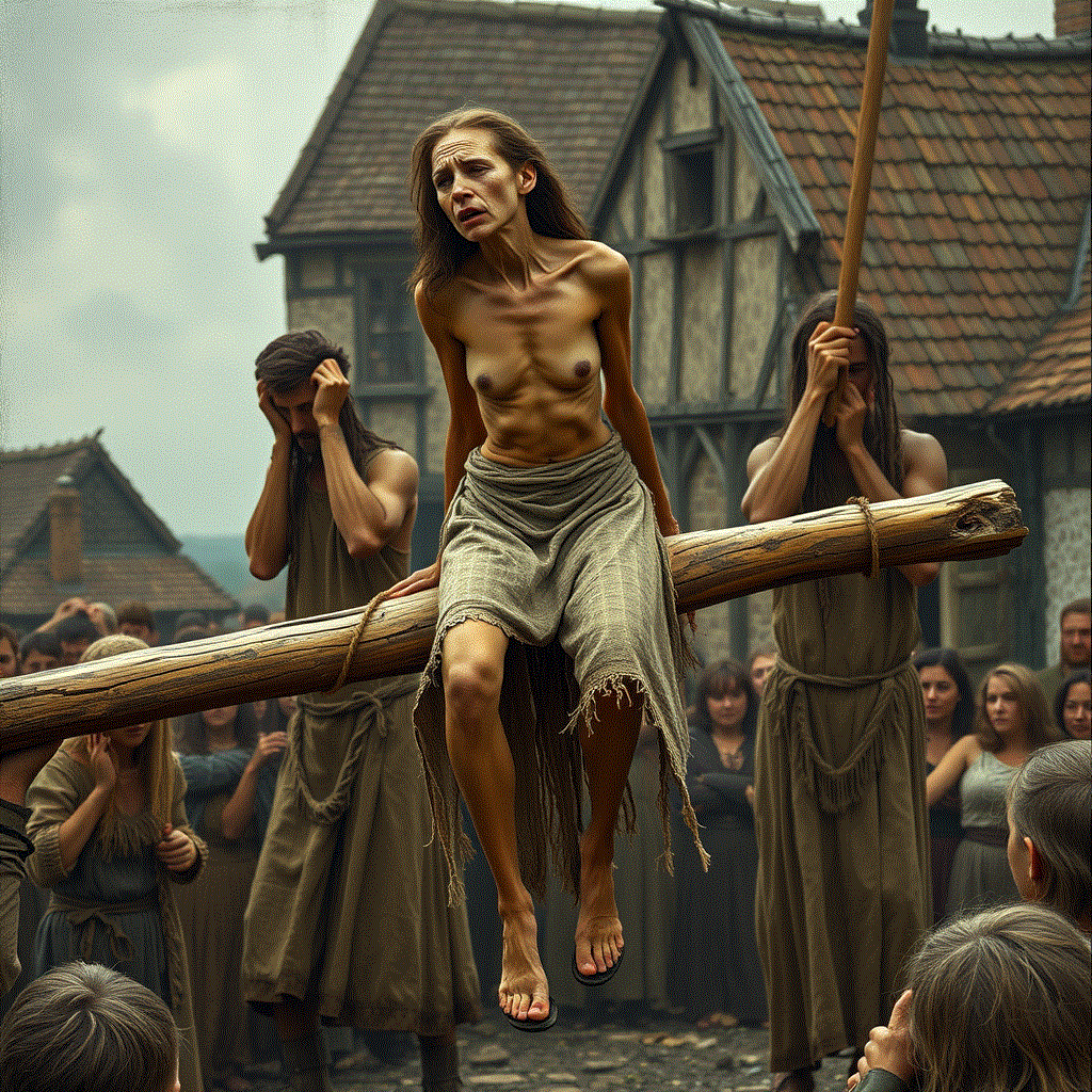 Melisa Blye is carried the entire length the village, several miles distance. They ask her if the wooden prongs are large enough to satisfy a slut such as her.