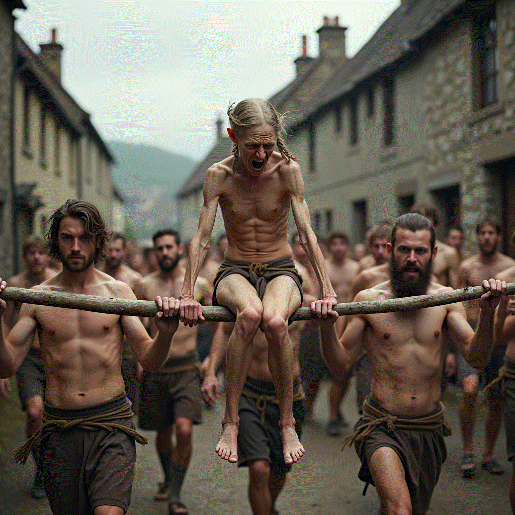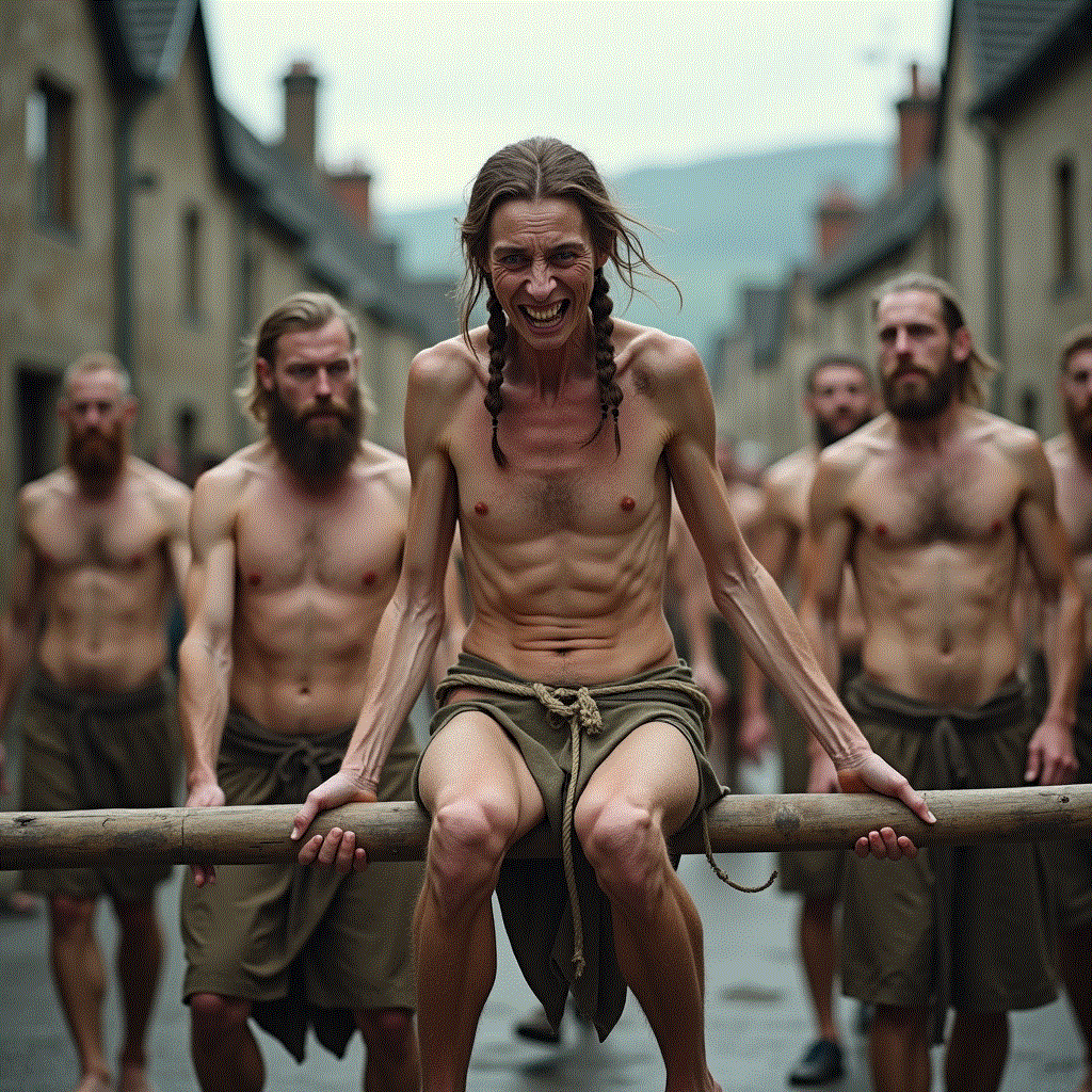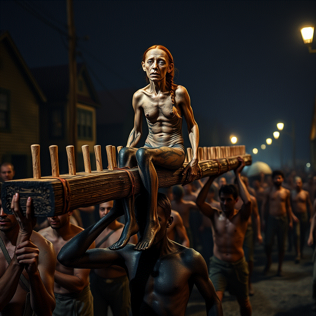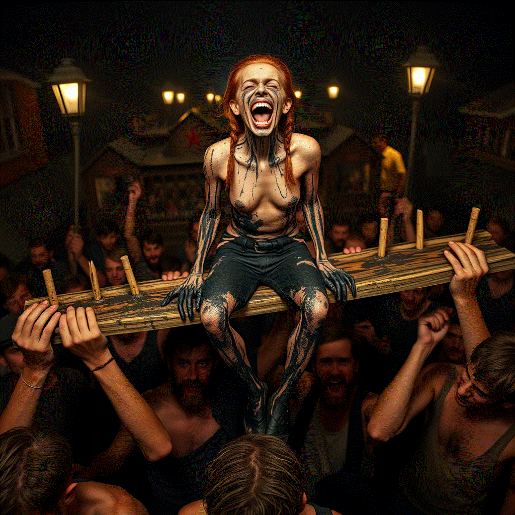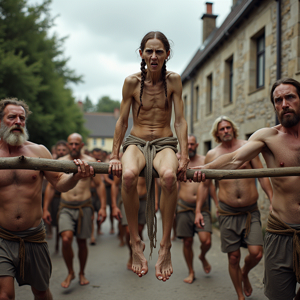 Melisa Blye is carried the entire length the village, several miles distance. They ask her if the wooden prongs are large enough to satisfy a slut such as her.
