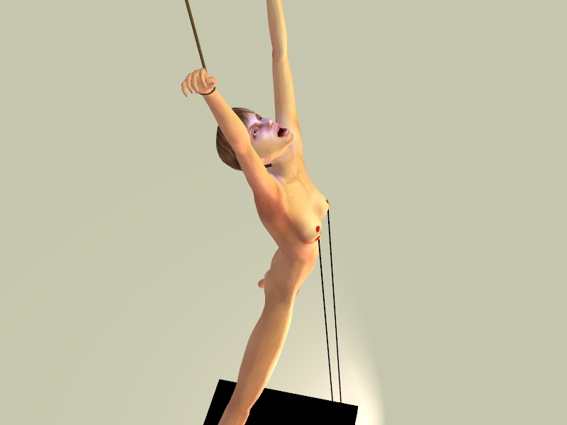 Just stretched out like that is painful and makes it hard to breathe. The muscles in her arms and legs are on fire from the strain. Unfortunately for her, there is more to come. She is completely at their mercy.