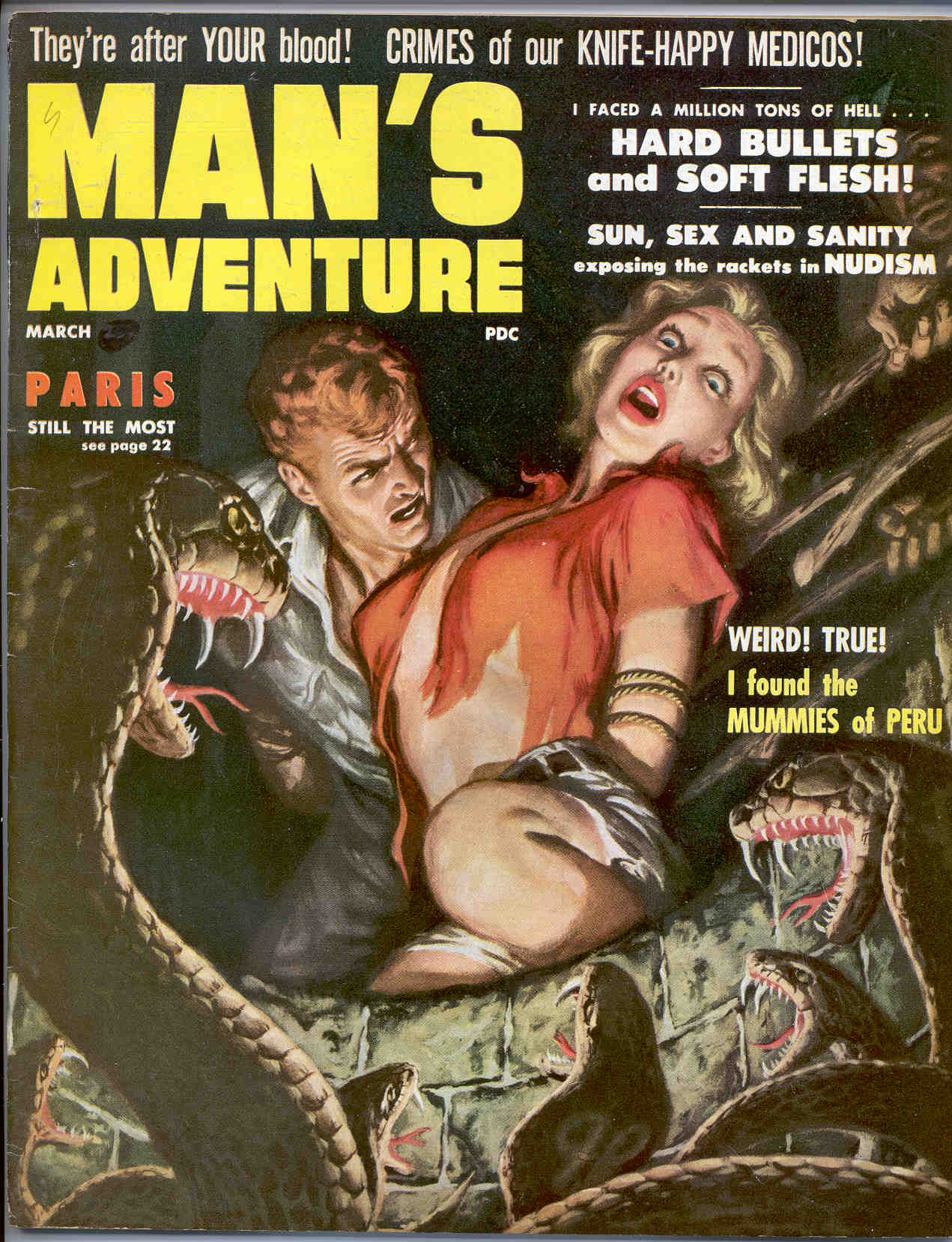 HOWEVER ( :? ), a number of people in my life are scared to death of snakes. So here's Man's Adventure 1958-03 with snakes and an appropriately clothed (that is, unclothed!) heroine!