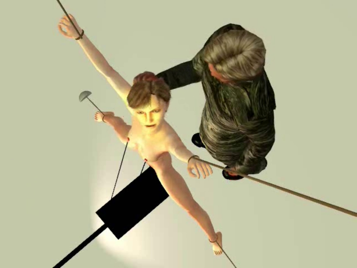 The torturer knows he can push her no further. He has her at the edge of unconsciousness.