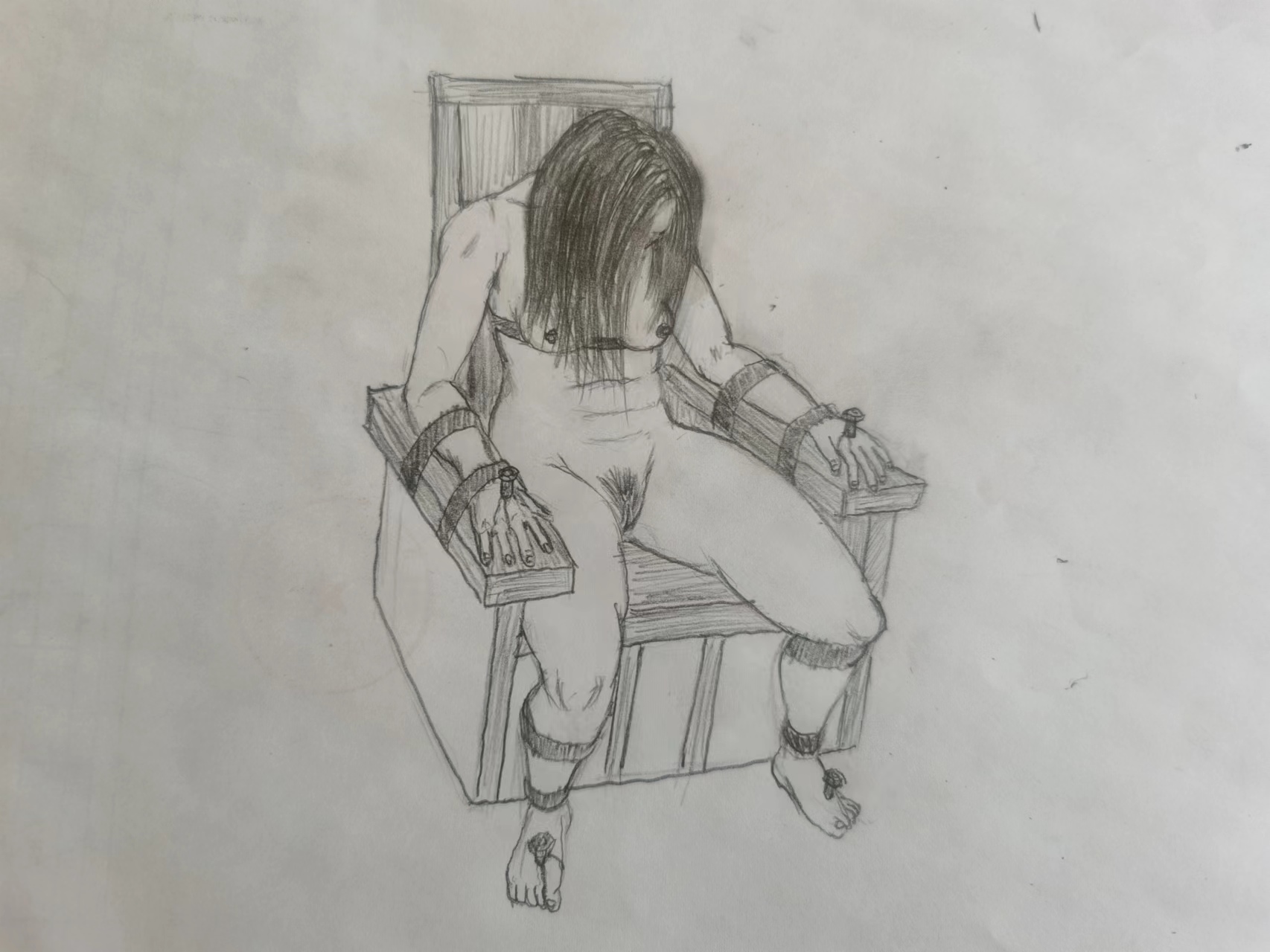 I love this one, and the way she sits unconscious with her head down in exhaustion & suffering. A very, very nice piece of torture art, and thank you for sharing. I was really starting to miss your work.