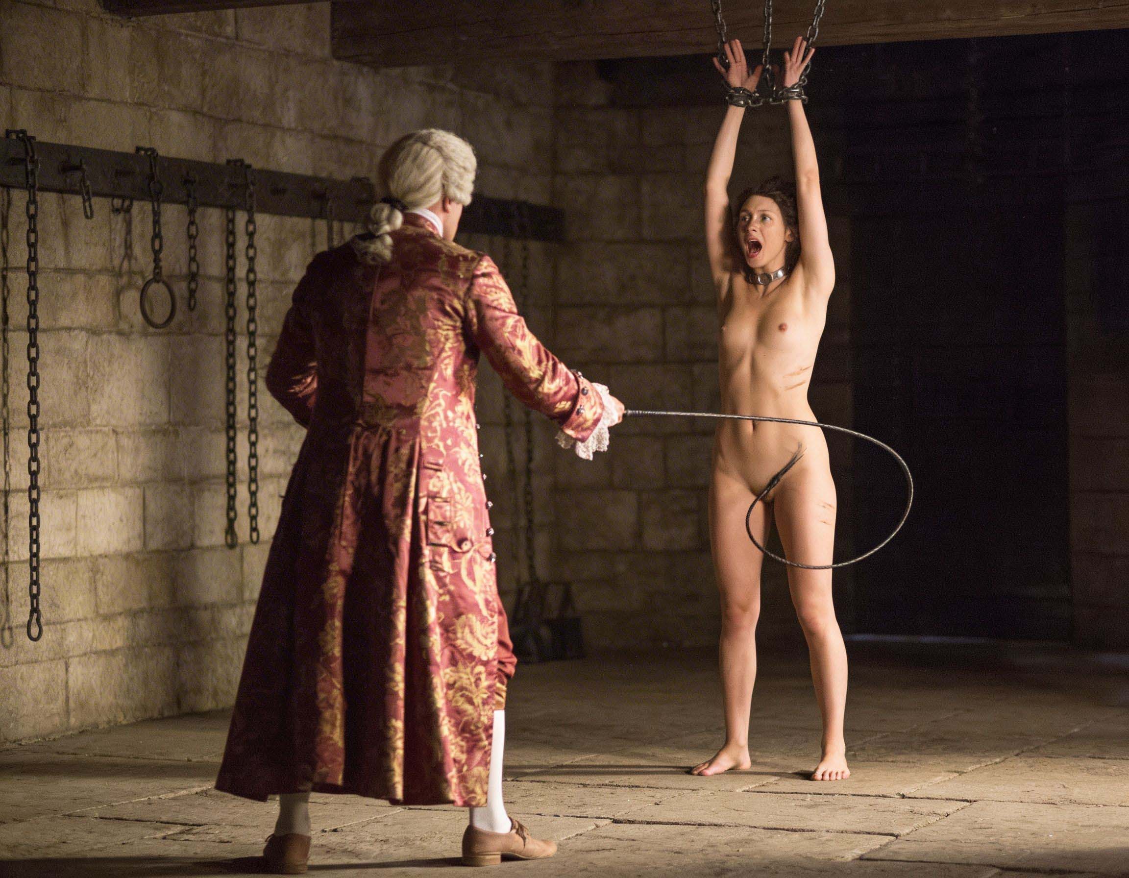 The young king just played with his pretty captive, patting her bottom and running the whip over the young English woman's flawless body. He ran the knob of the leather whip over Claire's full breasts,then pressed it into her nipples, causing the young woman to let outa slight moan. In a low voice, Claire addressed the king once again regarding the fate of her husband,‘Your Majesty, I politely ask you to release my husband after I have been at your service, that is really the only thing I ask of you.’ Luise replied snappishly, ‘Madame, I am the French king, my word is my bond, but I would like to remind you once again that my wishes and fantasies can be very challenging, so I ask you once again to concentrate on your role, you are now my prisoner, completely at my mercy, I can do whatever I want with you. If your acting does not meet my requirements, I will have to resort to harsher measures such as pincers and branding irons, but this would involve some bruising on your beautifull body Madame. I'm going to start whipping you now, but I want you to count‘ Are you ready Miss Fraser?’. Claire replied in a lowered voice ‘Your Majesty, I am ready’
