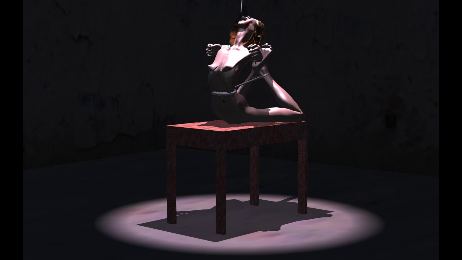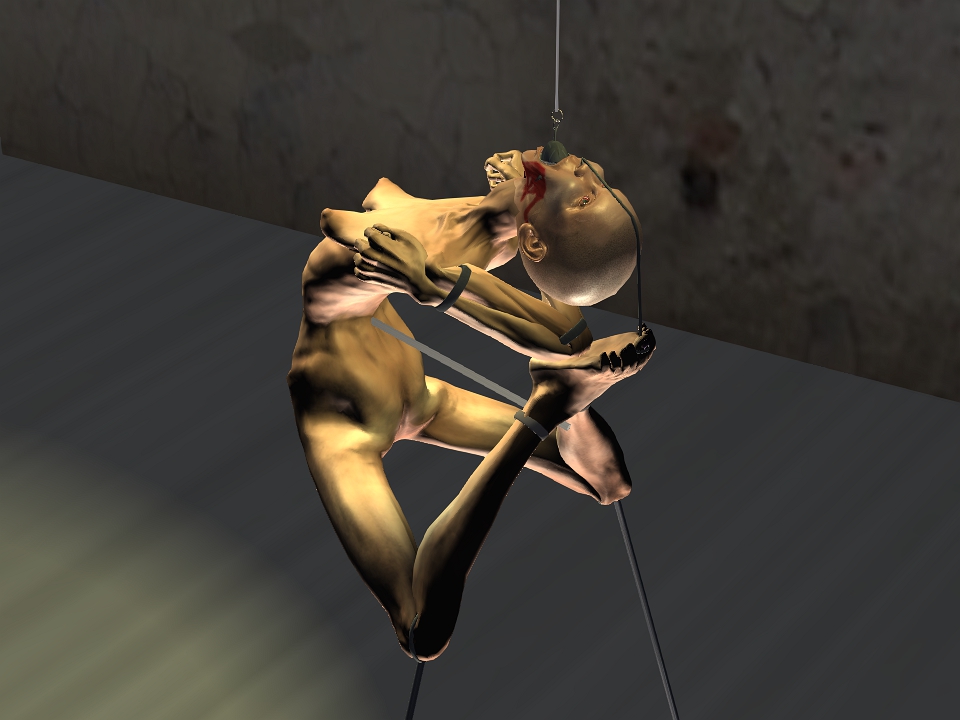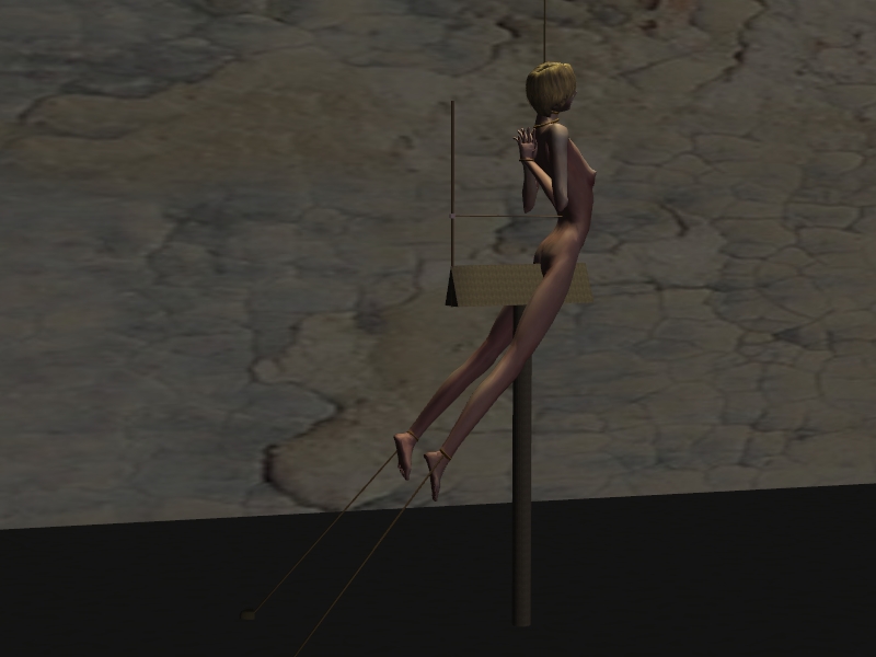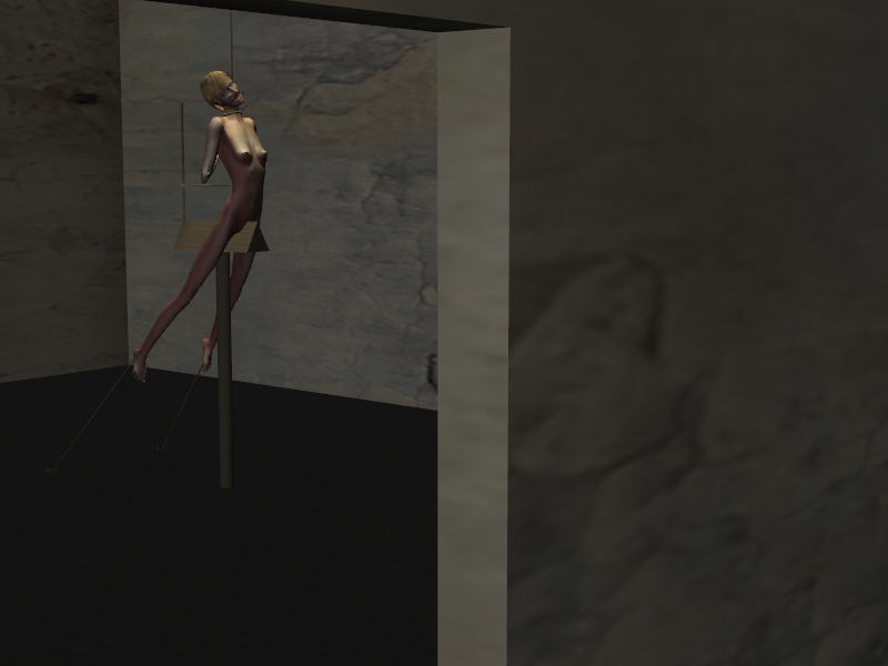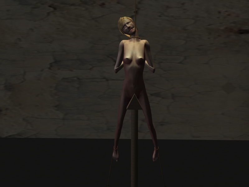 This victim is alone and only checked on every hour. She labours to breathe with the noose so tight.