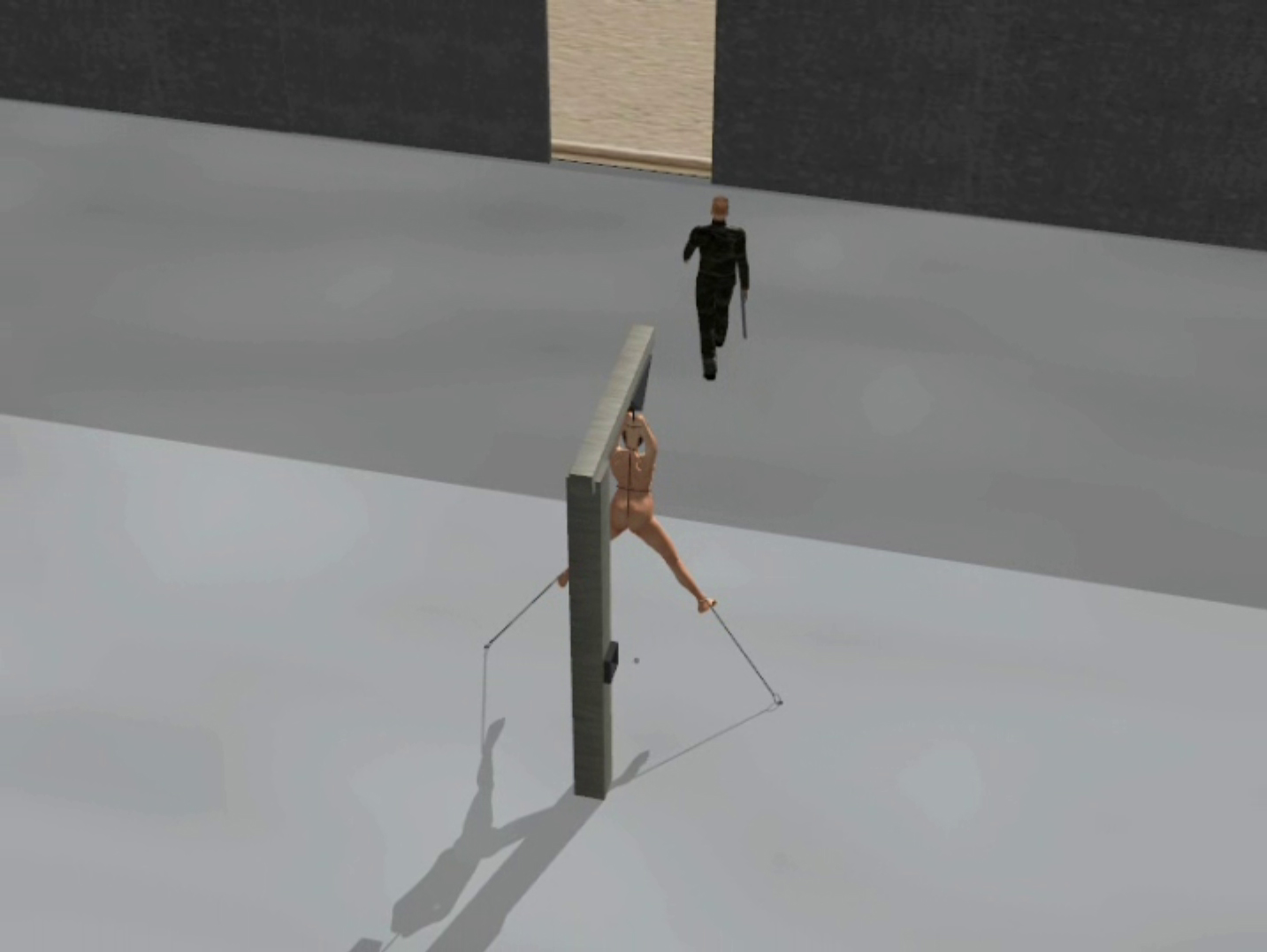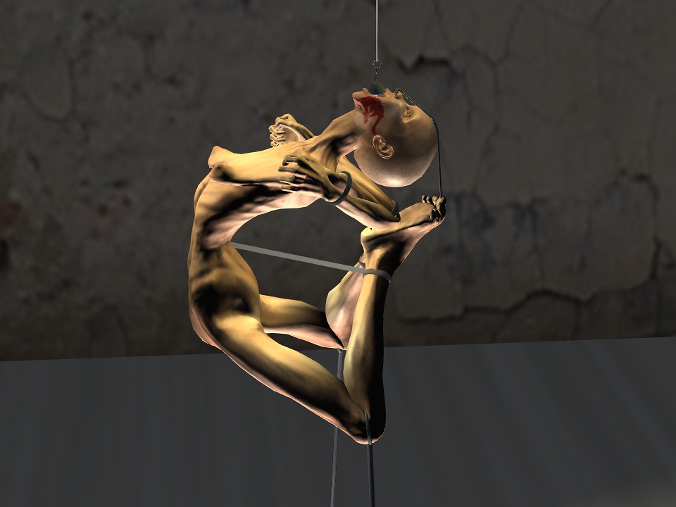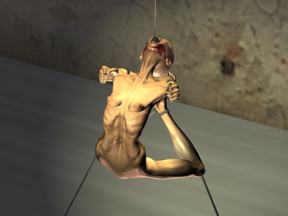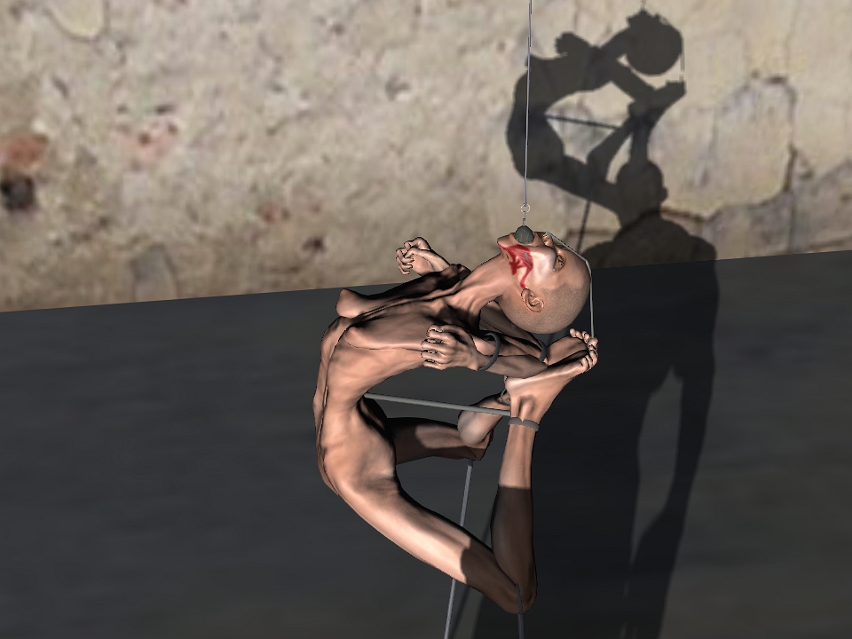 This victim is alone and only checked on every hour. She labours to breathe with the noose so tight.
