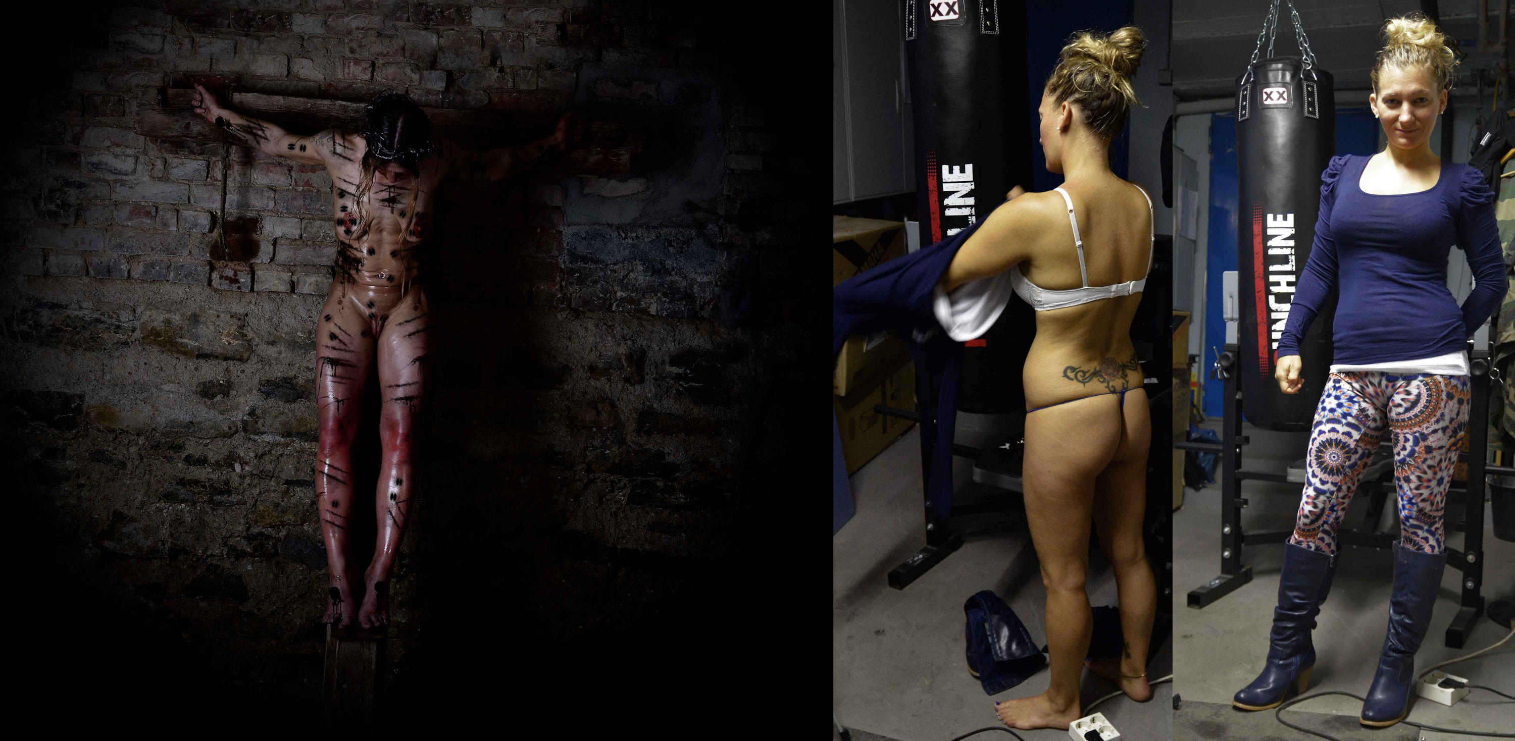 We stand and watch as the skewer slowly tears through her breast tips, and she falls screaming to the floor. But the bloody skewer is pushed through her breasts again, but closer to her chest. She howls in agony as she's hauled up a second time by her pierced tits. It will take much longer and frenzied struggles from the hot irons to make them tear through again. :twisted: