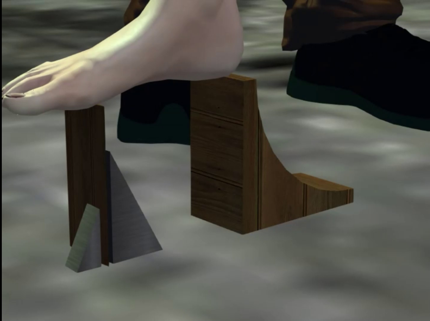 1: Now he has kicked that thin tall wedge away. The rope tightens around her neck and as it is attached to the rope from her ankle and wrists, they have to go up to compensate.
