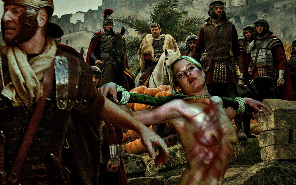 My favorite part is, of course, the skewer going into soft girl meat. The 2nd favorite part is Ms Dia Zerva locked in the stocks in the background, being entertained by the girls screaming. Lots of fun stuff happening here, and thanks Froggie.