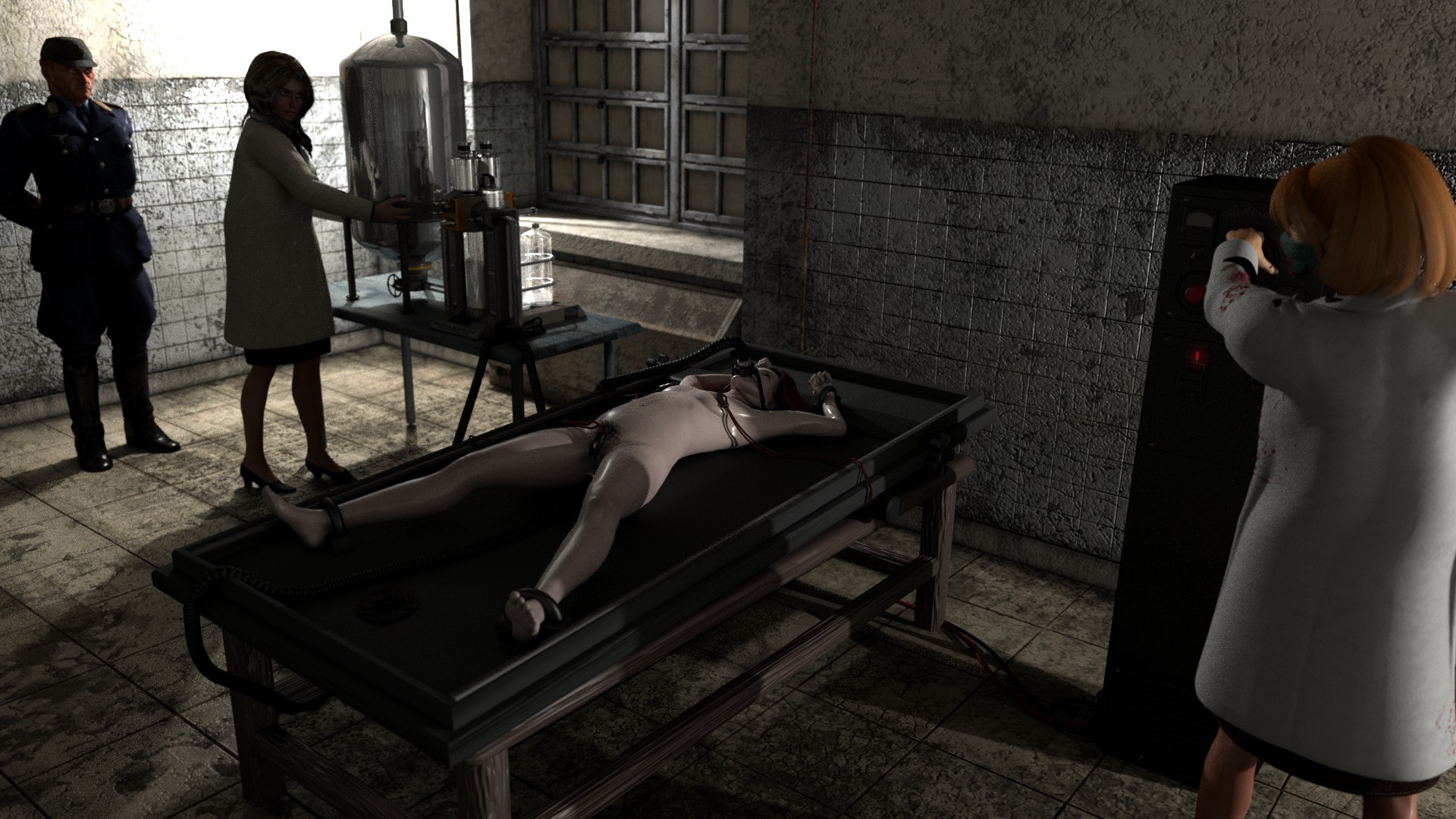 Another member of the Resistance fell. She was pumped a few gallons of water with hoses stuck in her ass and her throat, then electricity is applied to the most sensitive parts. No one ever made it past the first hour.