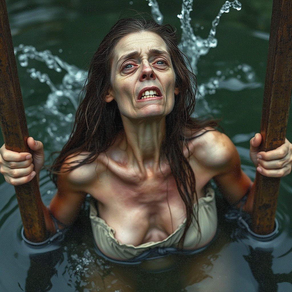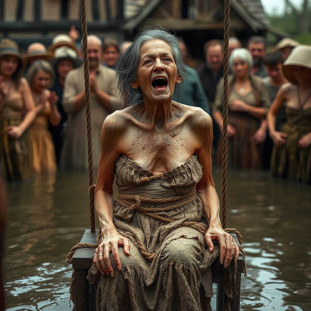 She comes up, gagging and coughing and spewing out the filthy pond water. The sound of the crowd's jeers echo in her ears. Exhausted, still gasping for breath, they plunge her down again.