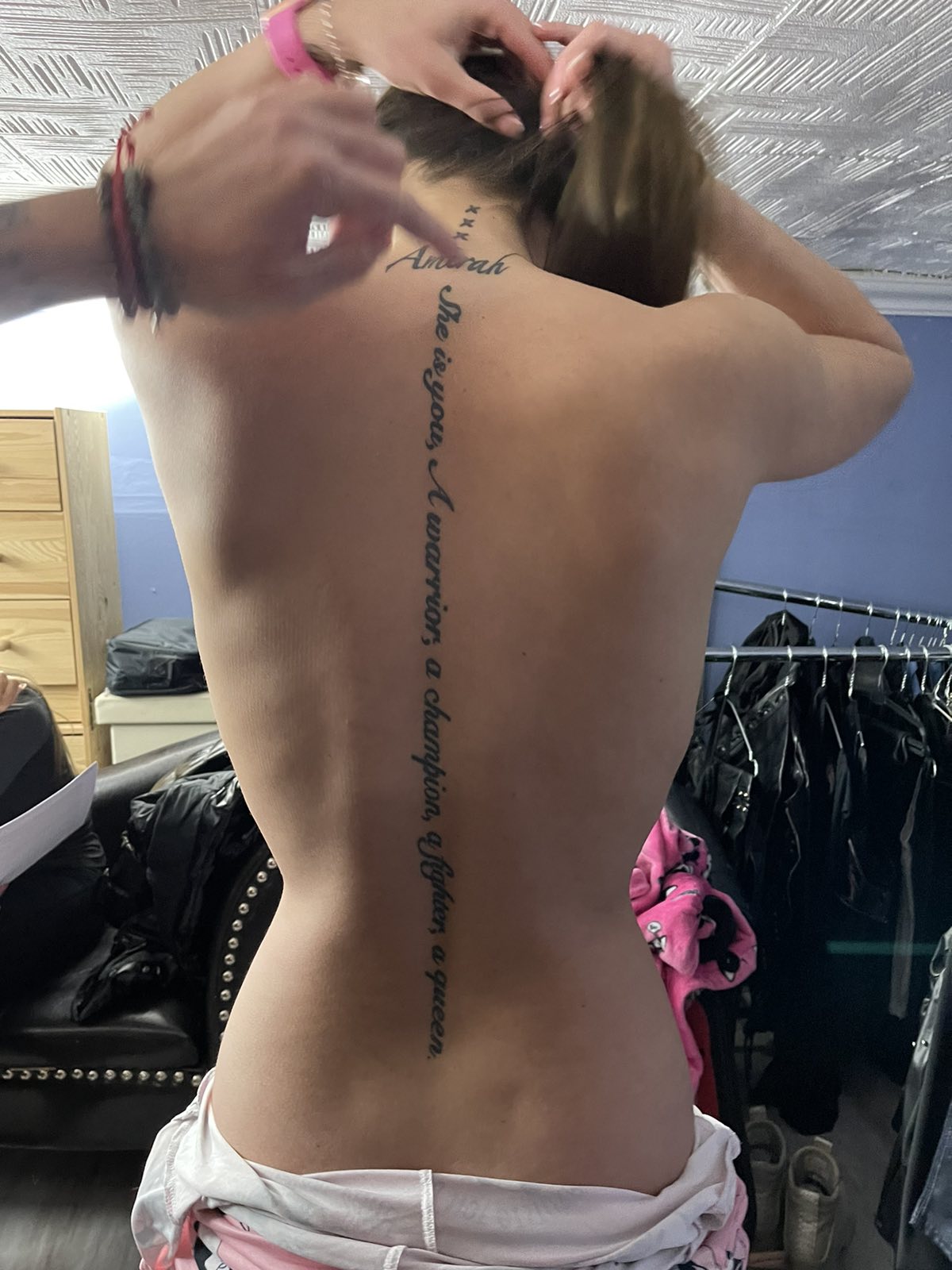 First picture shows a close-up of her back tattoo... If you could not read it during the movie, now it gives you a good opportunity to read the fine print.
