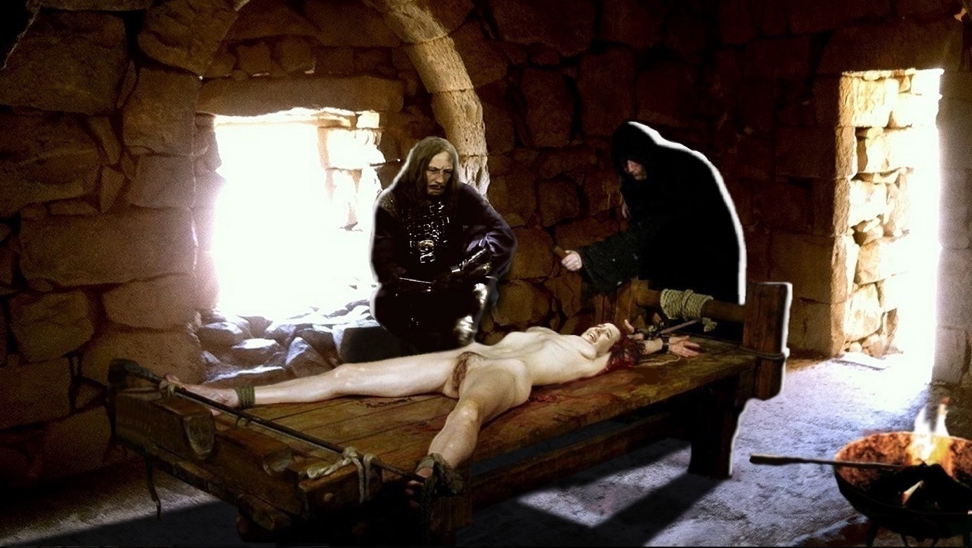 3) Another take (modified) on Lana Clarkson being attended to on the upright rack, for Barbarian Queen II.