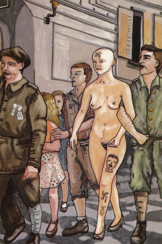 But first my uglification must go on. I still stand on the scaffold. The barber has a can with black paint or tar in his one hand, a brush in his other hand. I keep still as he decorates my naked body with the insignia of shame: A swastika on my forehead, and several other parts of my body. A Hitler cartoon on my belly. And most feared and desperately longed for: the word ‘P U T A I N’ (whore) on my décolleté.