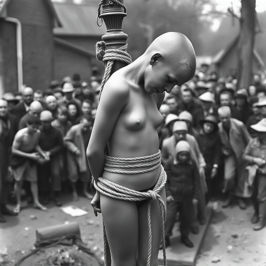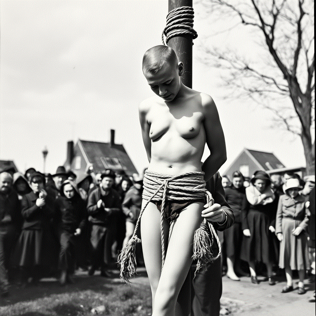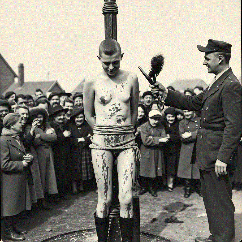 This is a historical postcard or souvenir that an allied soldier could send or bring home. It may sound weird, but I envy the blessed unfortunate lady in this picture. I’m afraid it’s rather unlikely, but all the same I hope for her, that she is masochistic and exhibitionistic enough, to secretly enjoy her walk of shame, her social doom – as I do in my fantasies. I wonder in what order the fortunate little traitor was so excitingly shamed. She knew that she had to expect some ruthless ‘purification’ treatment, as the cheering mob dragged her out of the house. I would have been very excited in her place. Would my clothes be ripped off my body, or would I be ordered to strip naked and I would obey knowing that resistance is useless? If I could choose, I would prefer to be forced to perform an involuntary embarrassing striptease. With every piece of cloth that drops to the ground I expose my body more and more until I’m stark naked. I would shiver with agonizing shame and, to my horror, of sexual arousal. The merciless jeers of the mob would increase my shame and arousal even more. Different from the picture I would have to walk barefoot – why should a ‘Nazi Whore’ be allowed to wear shoes? If I may make a wish – I would really enjoy wearing a wicked little accessory: Can my hands please be handcuffed on my back? Oh yes, that feels great! Now I’m perfectly helpless, delivered to the vulgarity of the enthusiastically celebrating mob.