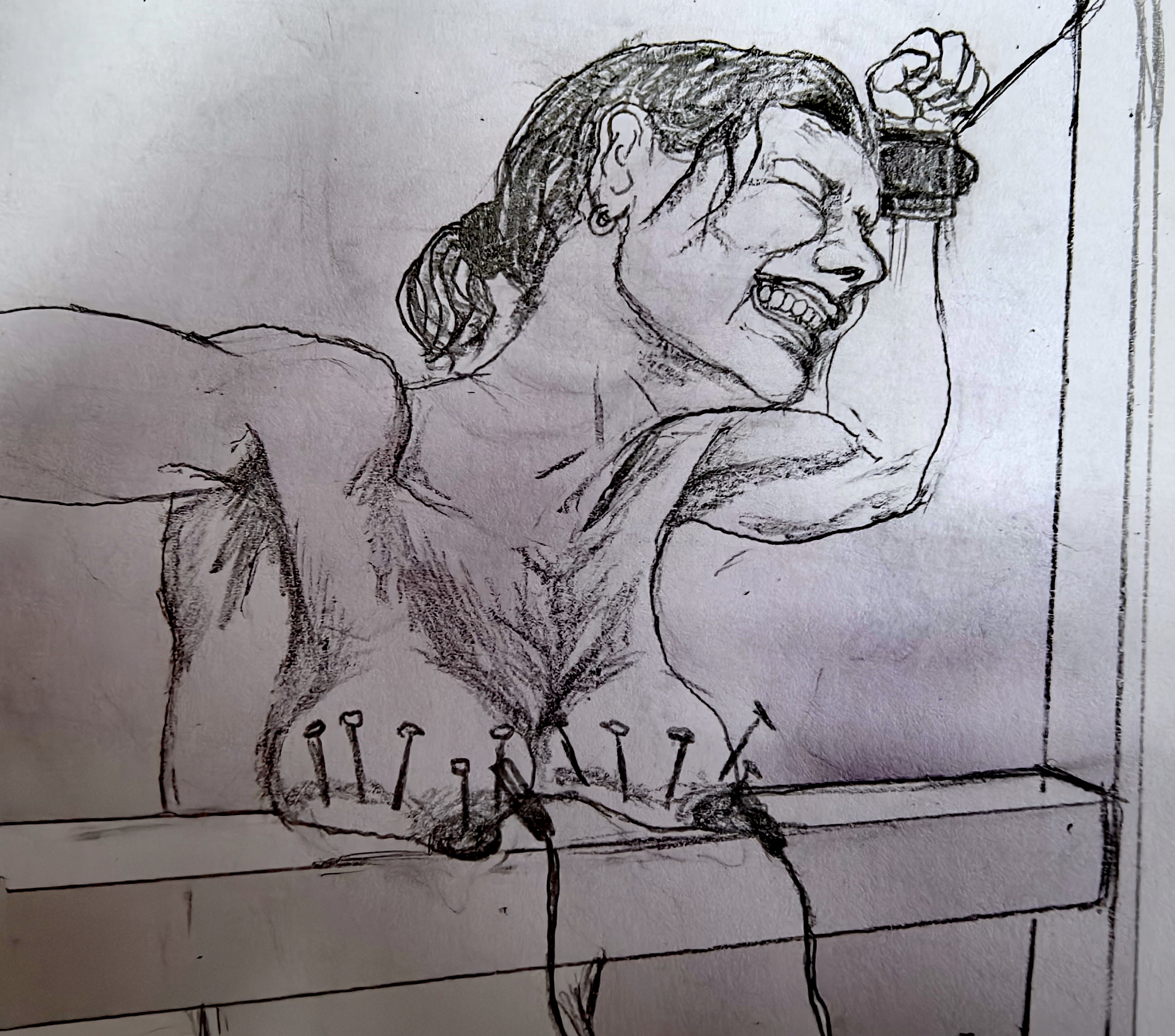 Another nicely executed facial expression of suffering, and my favorite... sharp things in female breasts.