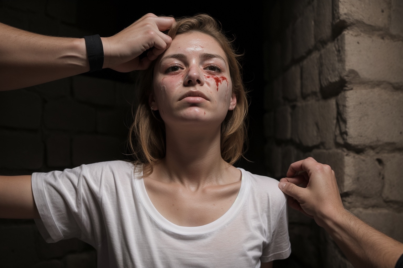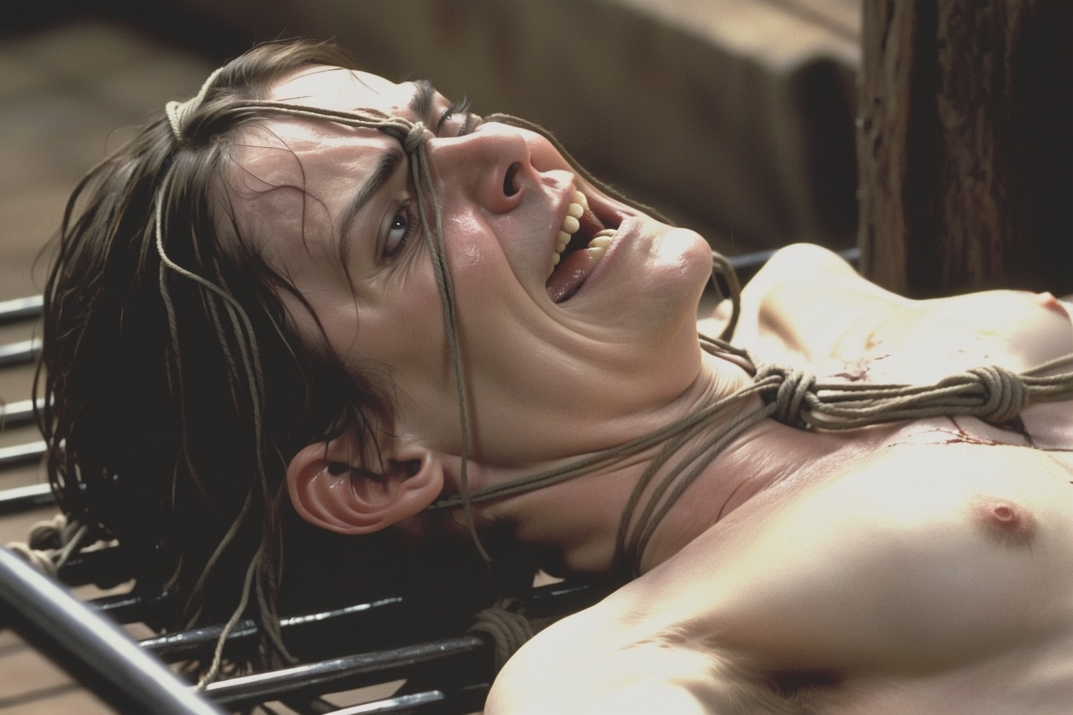 After beating her very badly in the first hour of the arrest, they laid her down with her hands and feet tied on an iron bed and were gang-raped by 2 men in a row, from the front. Isabelle was petite and had a tight vagina, and the torture of being fucked by oversized cocks was unbearable, tearing her in two. However, the miracle was that she hadn't bled too much.