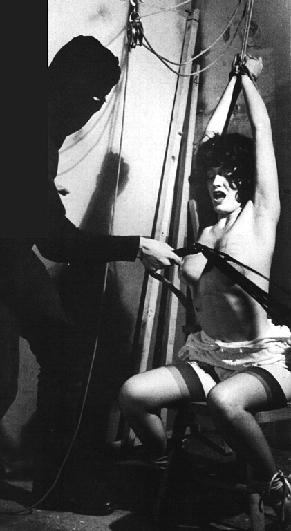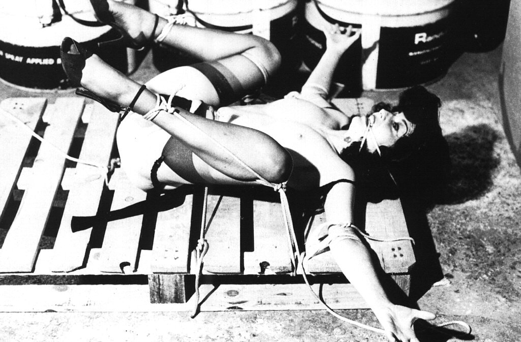 Here she is, tied in the workshop. Since she was a dancer, this "Kick the Moon" position was easy for her to do!