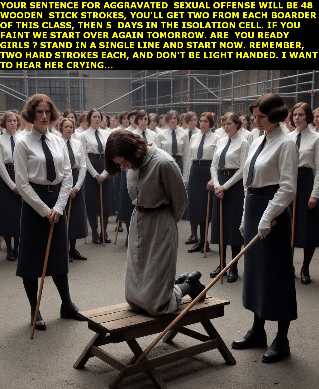 The convict is held steady and forced to face the public gallery while the birch is applied.