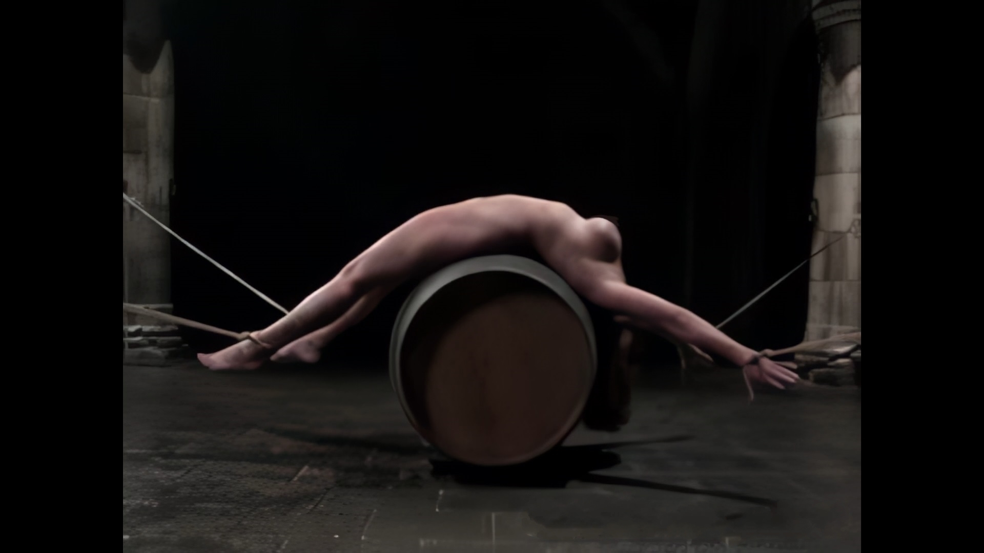 Pussy whipping and sawing are agonizing for Katy as she is tortured hung on the bars of her cell to prove her ability to resist torture.
