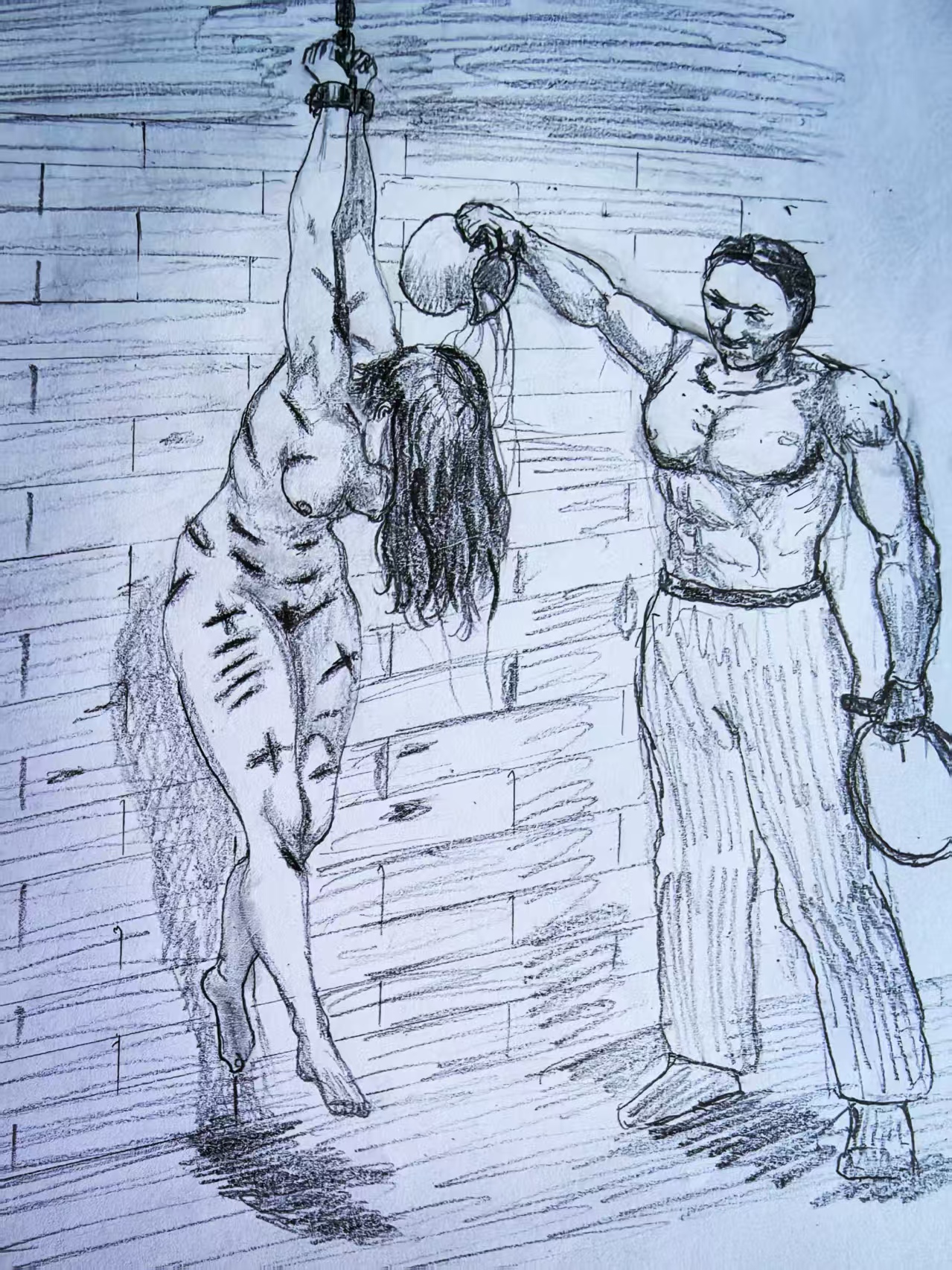 A very well done strappado with the feet off the floor (as they should be). I really like this one, and thanks for sharing.
