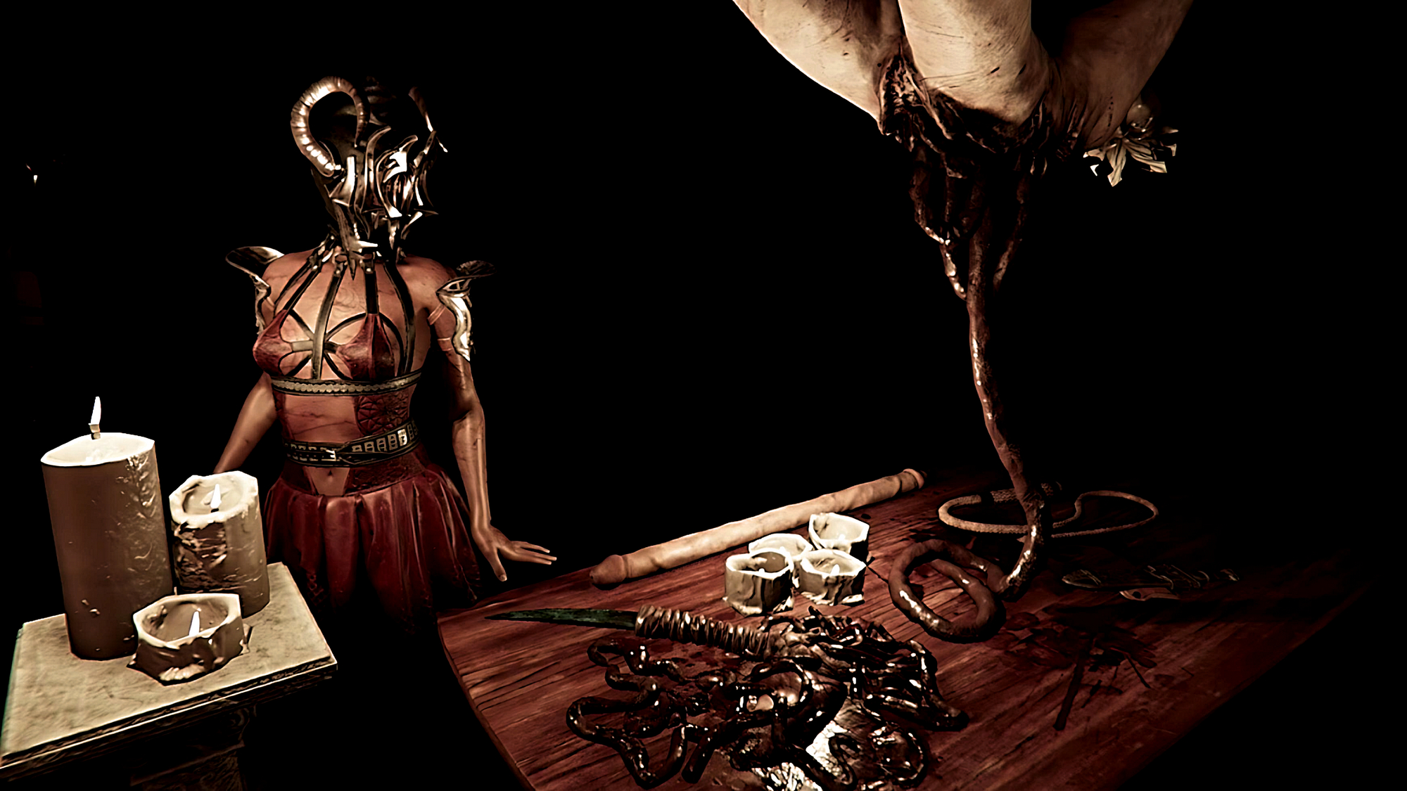 Maybe we can meet in her cell, awaiting when she will be served at dinner. I can see what happened to her silk skin. But she is still alive and her body is still intact. She knows she will die. But she hopes that dinner will be long and painful for her, before the guests will decide to kill her one way or another. Maybe I will even see how the guests will arrive, and she will be presented to them as a torture meat. Priestess will drag her to the table, and hang her on the beam above. And if I will stay long, I will hear her first screams.