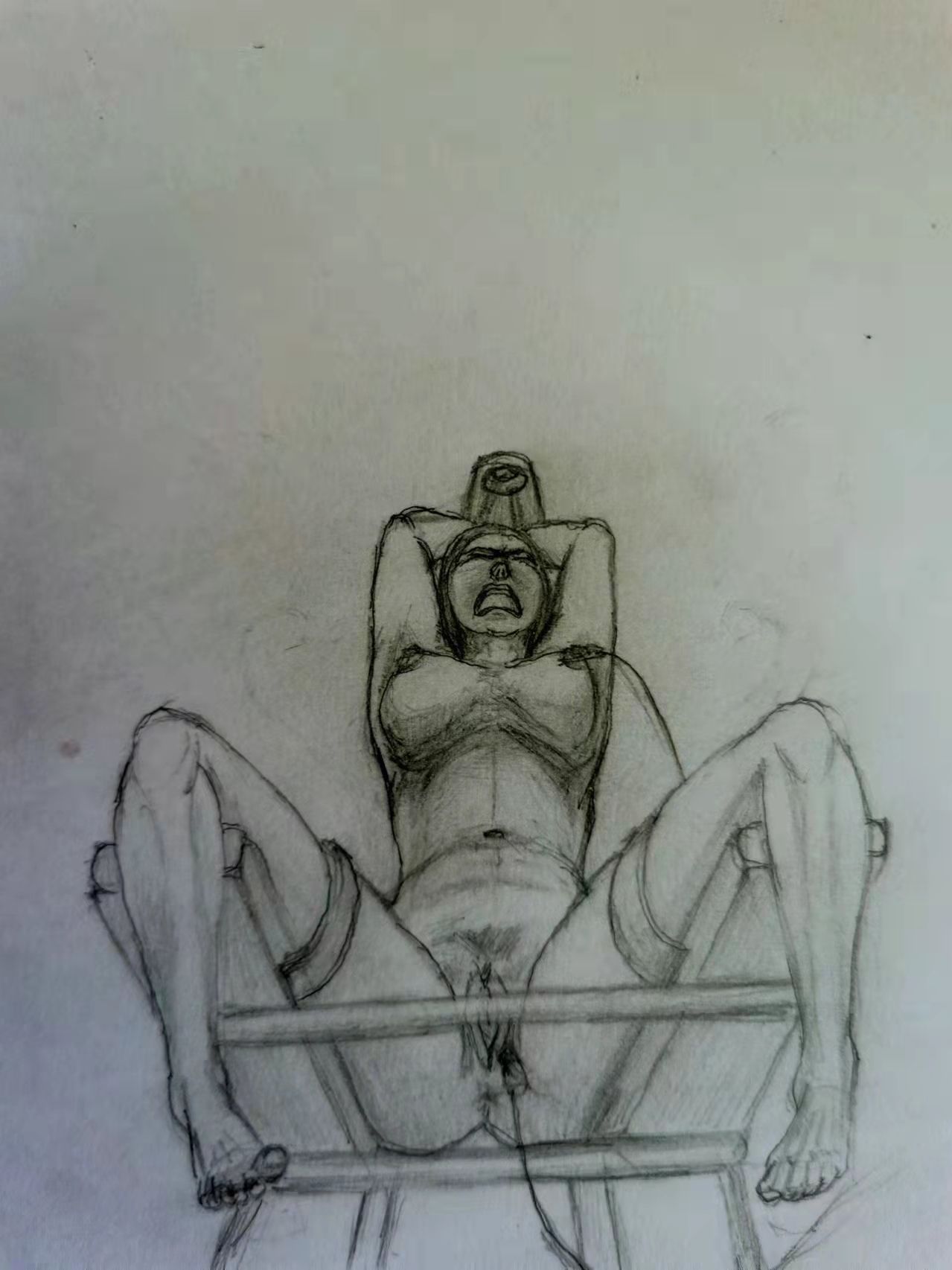 Her position is limited to just one pose throughout, but it’s a good one - suspended (tiptoes anyway), AOH and legs spread wide. The best part is hearing her wailing, which needs no translation, together with the long closeups of her face contorted in pain. I found myself talking to the screen - “Yes, yes… HURT her… fucking HURT HER!!!”