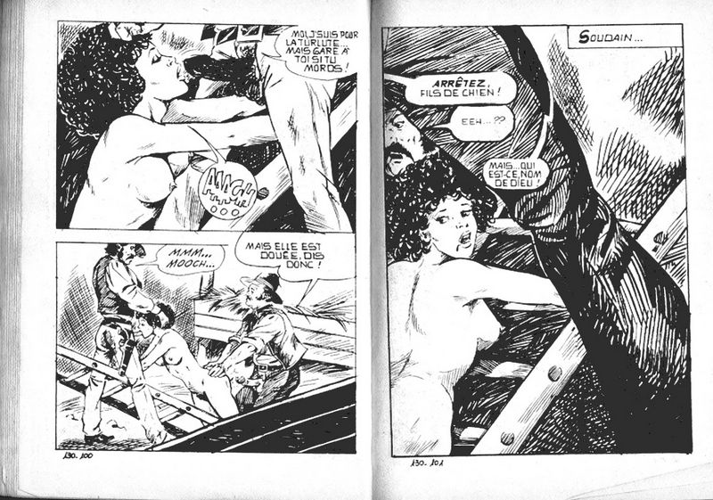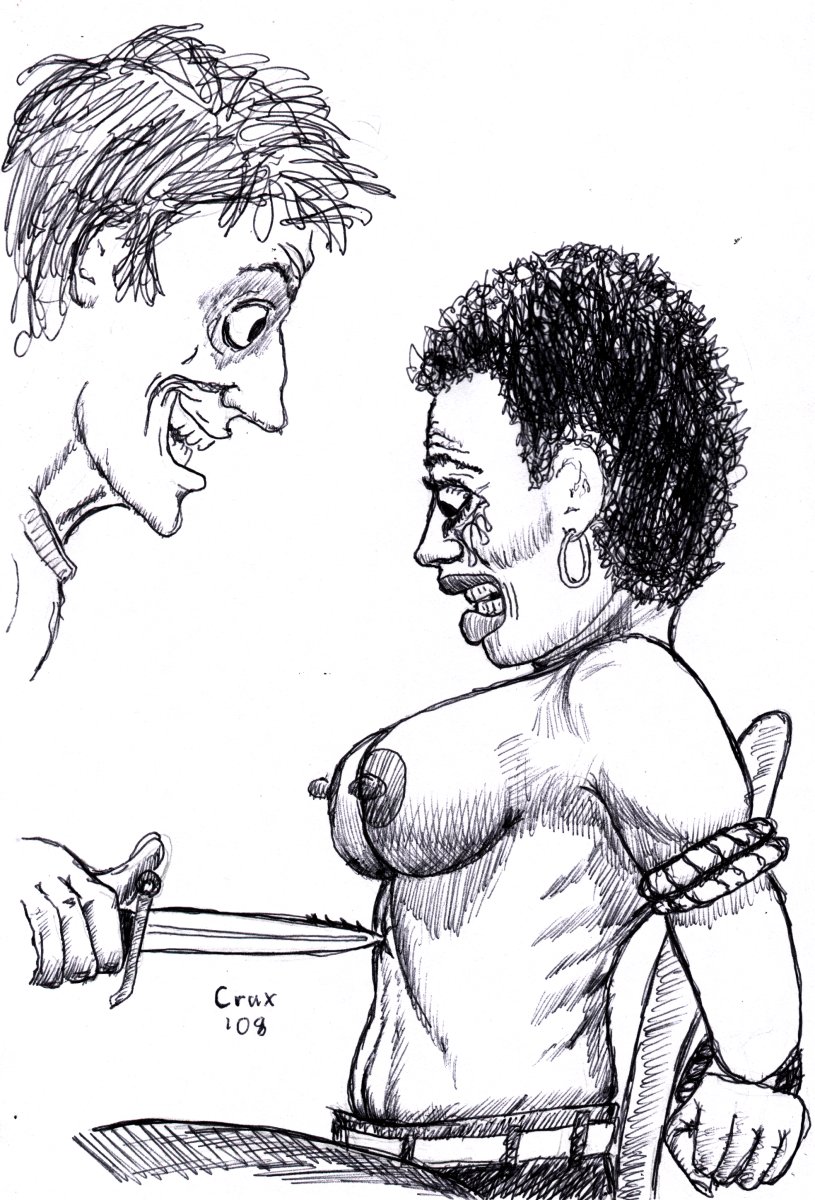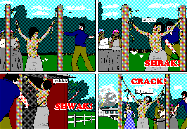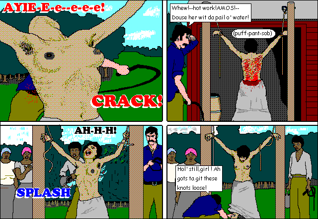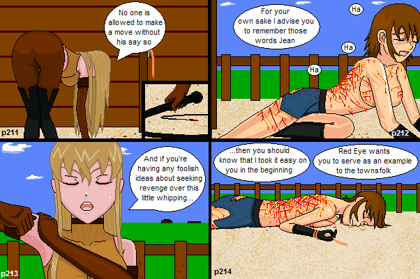 Jean gets bullwhipped. You can count the lashes because for each lash appears the text:"Crack"