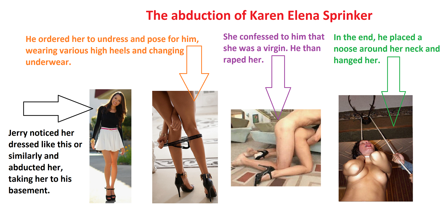Karen was a student whom Jerry abducted at gunpoint. She was wearing a mini skirt and high heels. Karen begged him not to hurt her and said: