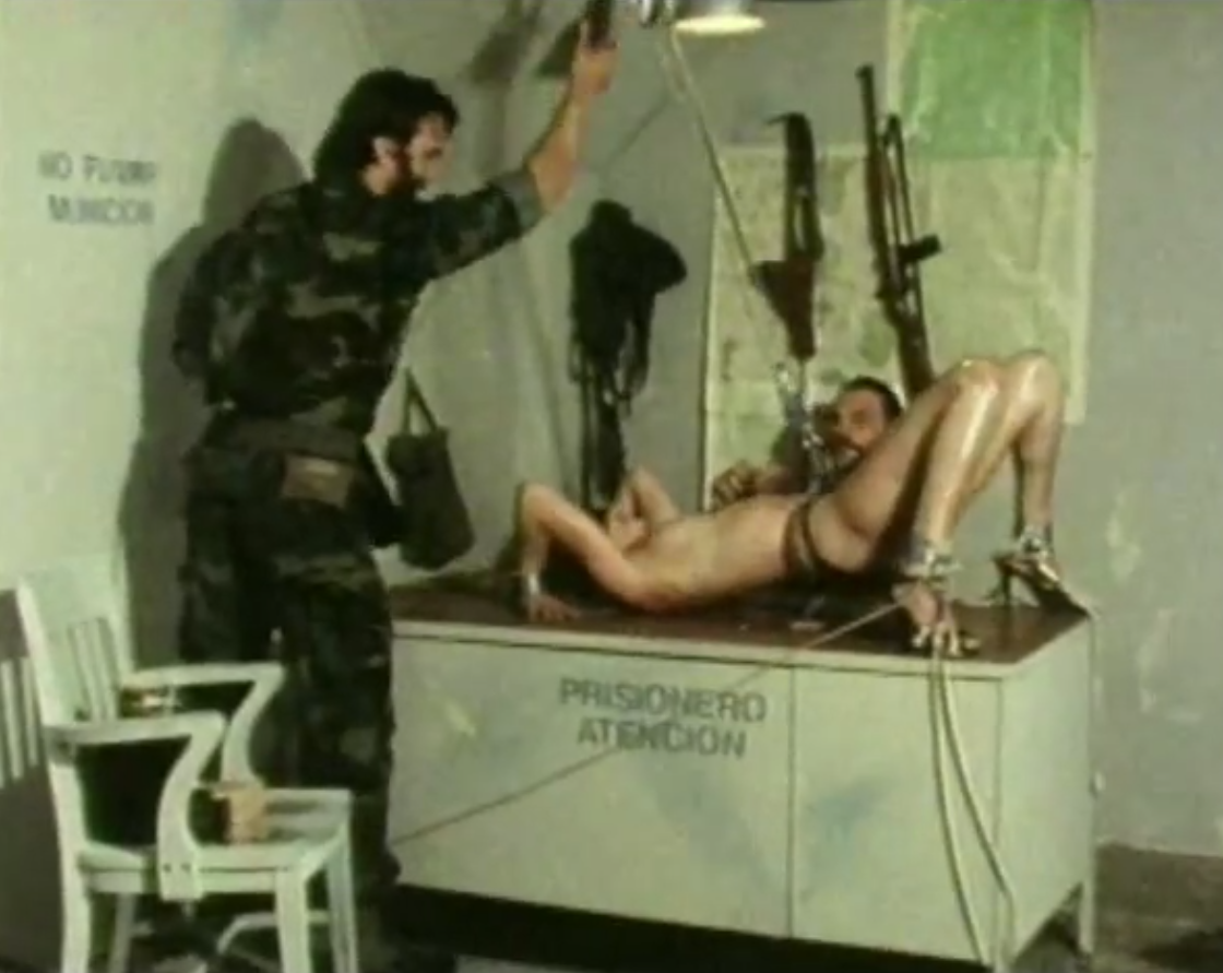 The attached are from the CalStar classic 'Tourist Trap' - Jenny (Sybil Lake) has been captured - accused of being a spy she's being interrogated. Flat on the Commander's desk, she's hoisted into a painful back arch using a crotch rope