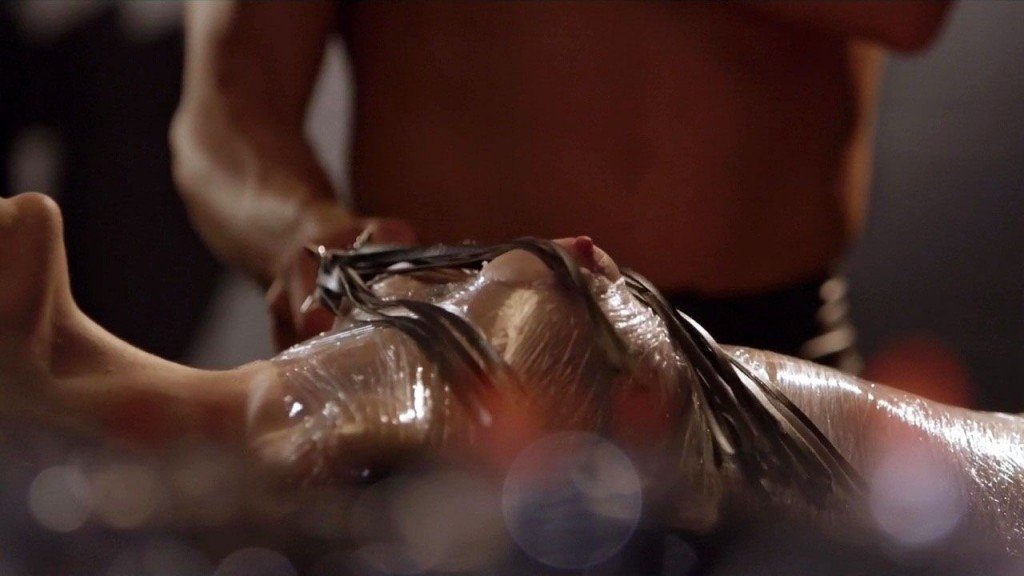 I was disappointed with this scene because they didn't actually cuff her hands. She was just holding on to the wrist straps.