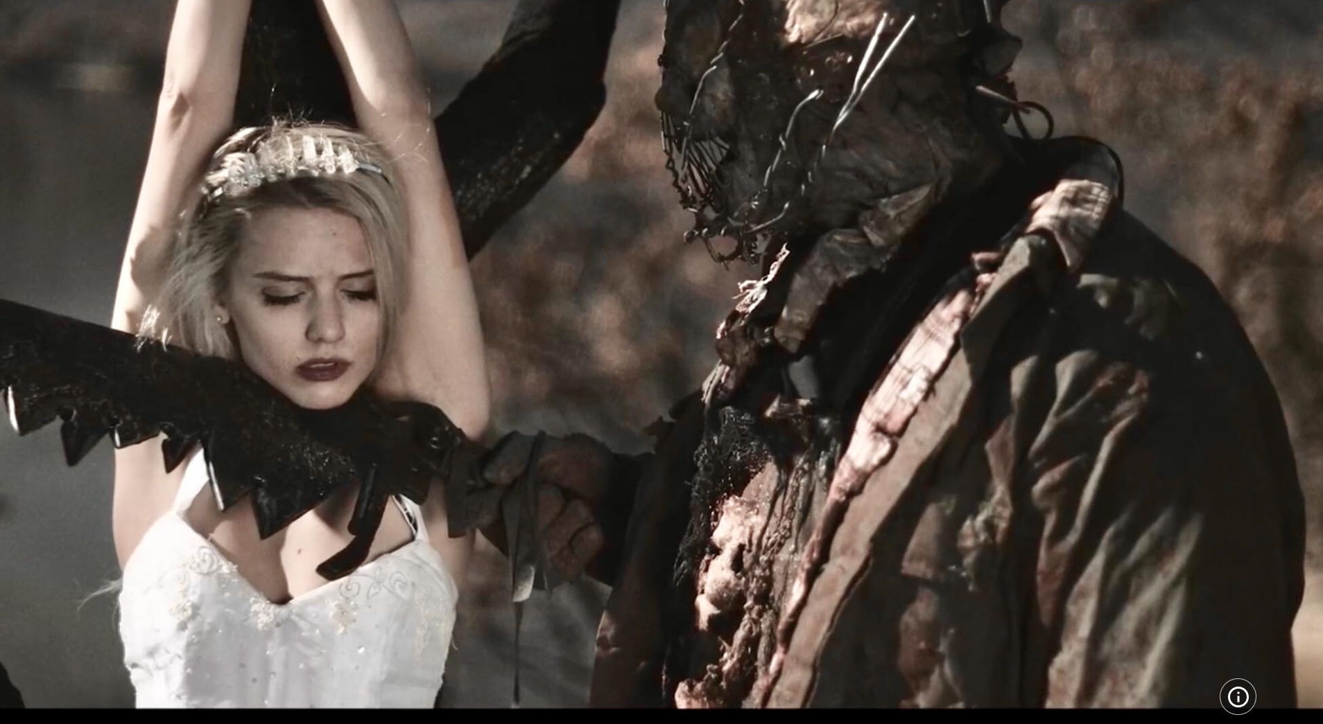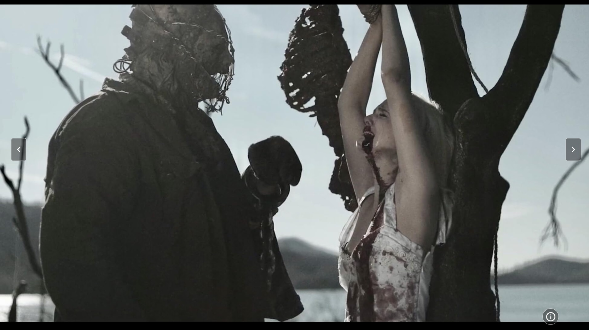 At the 43 minute mark, we see an unconscious Ellen (hot blonde Emily Sweet) tied AOH to a tree in a sleeveless white dress as the title antagonist Havoc approaches her and lifts her head up with a jagged sword. After 2 minutes of cutaway action, Havoc wakes up Ellen by tapping her forehead. As she struggles and yells for help, Havoc goes to get more tools where we see an unknown woman in a seated position chained to a tree. She screams before Havoc kills her with a screw tool. At 48, Havoc takes a cup of the unknown woman's blood and forces Ellen to drink it. She spits out some of the blood before Havoc tears off the dress to reveal her nice breasts. After some gunfire distracts Havoc away, Ellen frees herself.