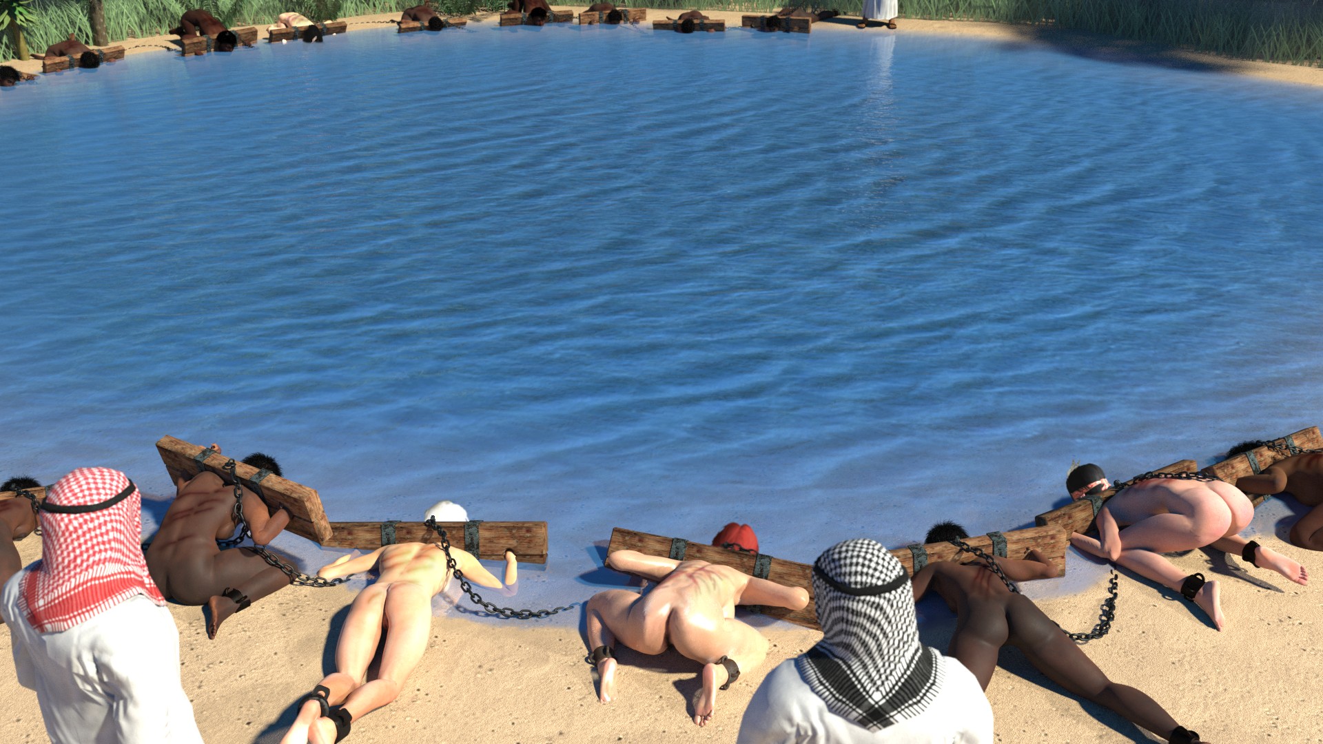 The captain had her restrained by two of his man, and said: "Now this we cannot have. I thought you all understood you were just objects. We cannot have an object rebelling to his owner. This idiot was about to cost us a profit, but your future owner may well order you to drown yourself, if he so pleases, and you would be wise to obey. But I see you learned nothing yet. No worries: as a reward for your behavior, your yoke will be removed and, since we will be staying in this oasis for a couple of days, we will make sure that you dry up well after your bath. Maybe, to drive the point home, we will give the same boon to your three friends".
