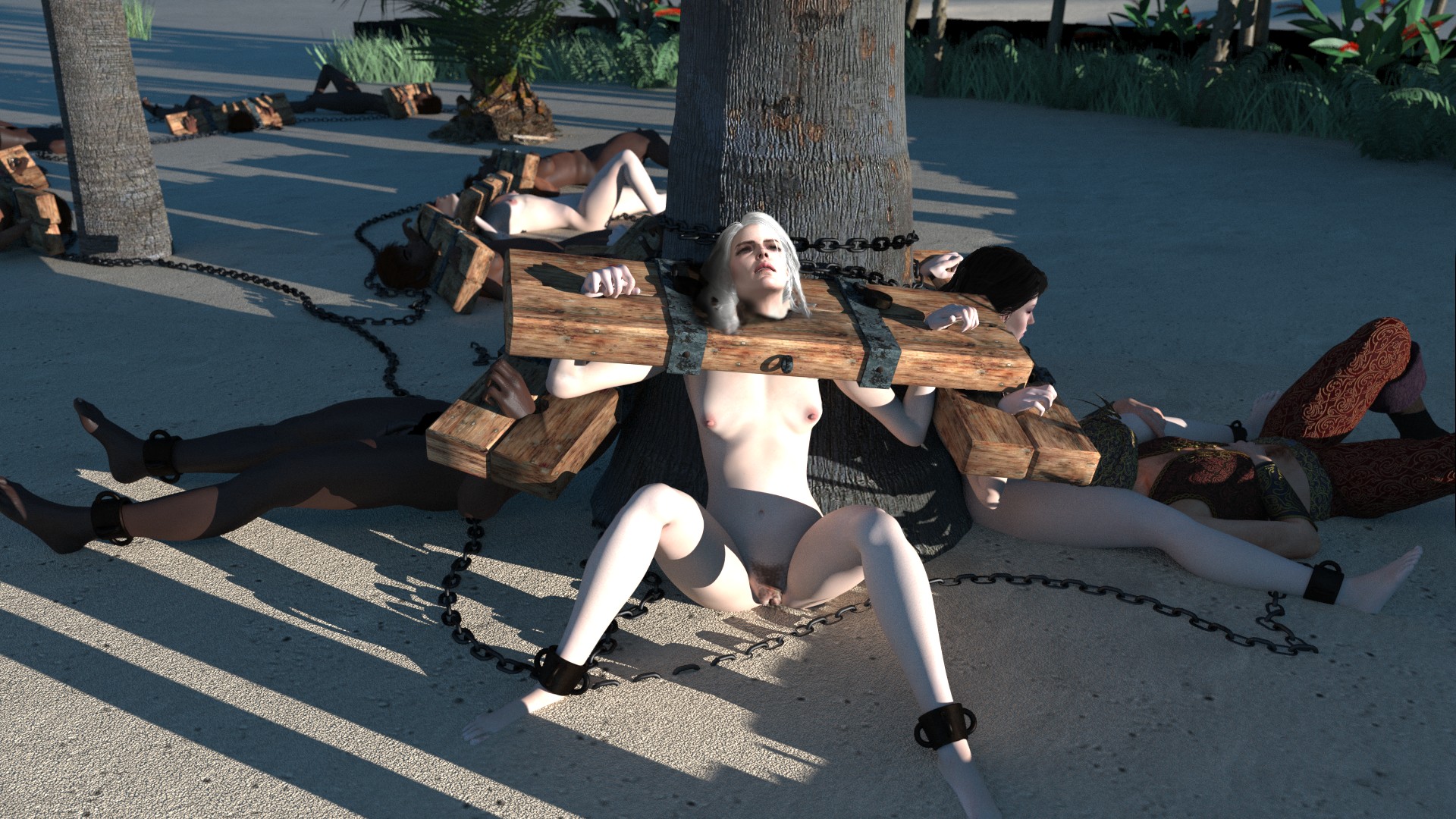 All four kept their tempers in check. Till a day when they halted at an oasis... After a long march over night, they were allowed to drink when, at dawn, they got to their destination. Of course, drinking while in yokes was not easy, and they had to assume demeaning poses while the guards laughed and argued which one had the best ass. One of them walked up, put his foot to Triss's not unremarkable derriere, and unceremoniously kicked her in the water. Unable to stand up due to the yoke and the position Triss was saved from drowning by the leader of the slavers who pulled her out. While he was scolding at the one who had kicked her for risking to compromise valuable merchandise, Triss, having recovered her breath, spun rapidly around and managed to hit the culprit on the side of his head with her yoke.