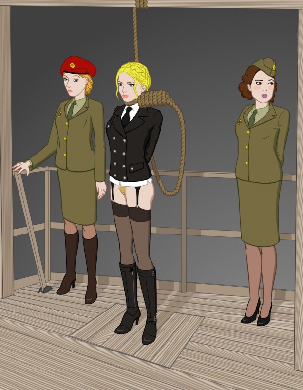 Nice little artwork showing the tables turned and a nazi bitch getting her come uppance. I like that they're not content with executing her - they've decided to have some fun and add to her humiliation by removing her skirt and panties.