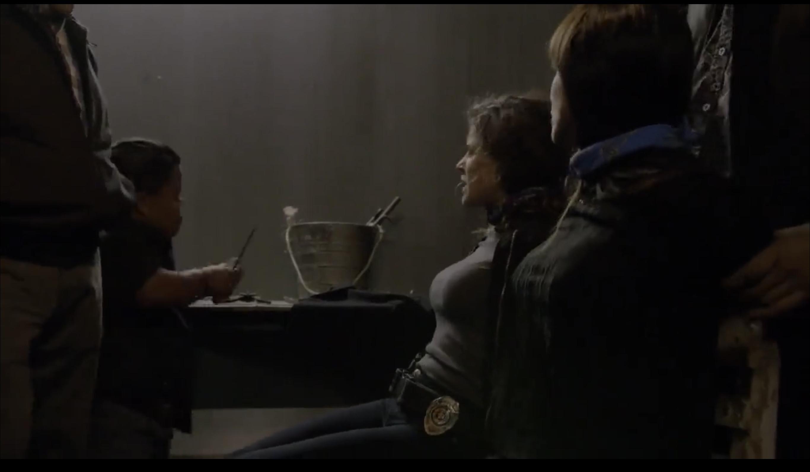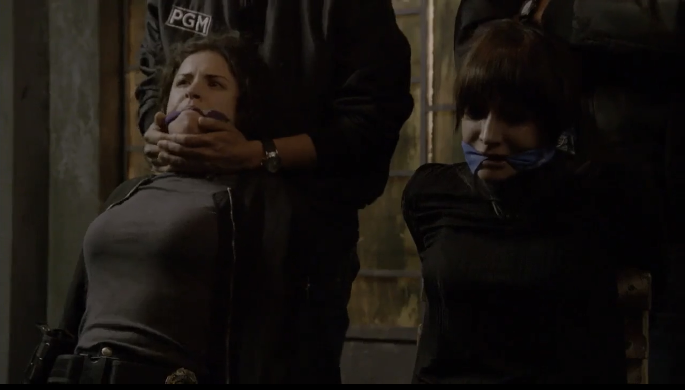 Laura Palma and Thanya Lopez are abducted, hooded and tied to chairs. One is a cop (Palma), and she looks incredibly hot in her tight detective clothes and gunbelt with badge. It’s mainstream, so we don’t get any nudity, sadly - but it’s a great scene. We get to see the cop’s initial toughness break down when she’s threatened with being cut by a little person with a large blade. There’s some great begging, crying and whimpering if you have the volume up. Another great scene that leaves us GIMPers thinking If only…