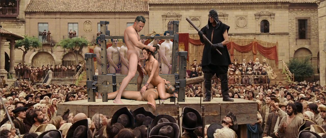 Jamie would not come before the time for tonight's "entertainment" though. As the men undressed Claire, she kept her face as blank as she could. Fueled by copious amount of whisky, Brown's gang were more raucous and impatient. Peter Dewson shoveled Claire over to a haystack and ordered, "get on it, on your all four... like a bitch!" “No! Your perverts!” Claire resisted and would not get into the humiliating pose. Getting impatient, Brown unbuckled his bet. He pushed Claire against the wall and slapped her hard on her buttocks with the belt. “Ahhh!” Claire cried out painfully, her arse bright red in a flash. Another slap landed with a crack. Then Brown turned her over and asked, “are you going to do as told now?” Claire didn’t answer but kicked him on the shin as hard as she could. Furious, Brown slapped his belt right across her tits. The pain on her sensitive parts was much sharper than on her butts, and her cry turned into scream as she doubled over with her arms raised protectively over her breasts. Brown dragged her by the hair to the haystack and threw her onto it. “Now, get on your all four! Do you hear me!”