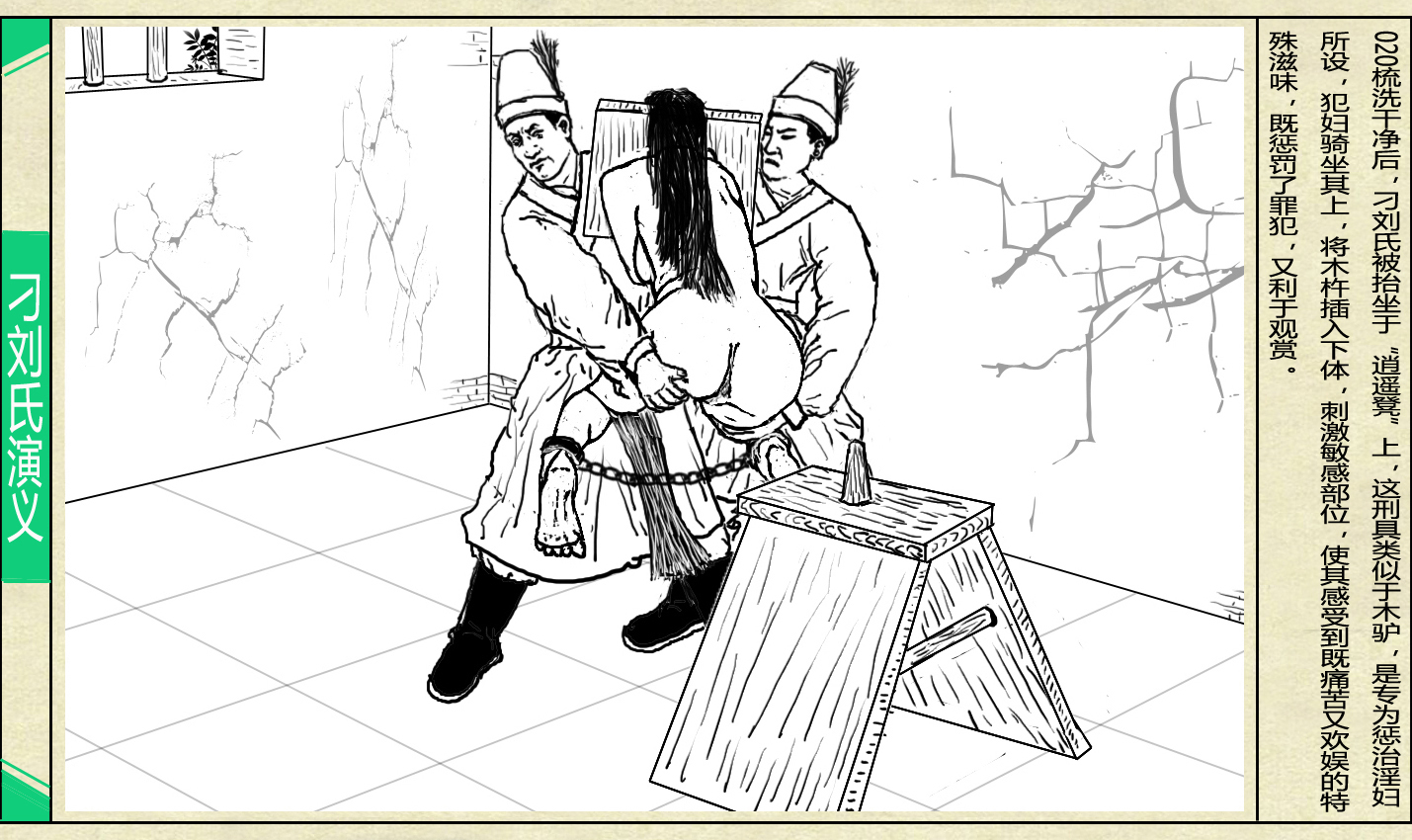 梳洗干净后, 刁刘氏被抬坐于 “逍遥凳” 上, 这刑具类似于木驴, 是专为惩治淫妇所设, 犯妇骑坐其上, 将木杵插入下体, 刺激敏感部位, 使其感受到既痛苦又欢娱的特殊滋味, 既惩罚了罪犯, 又利于观赏.